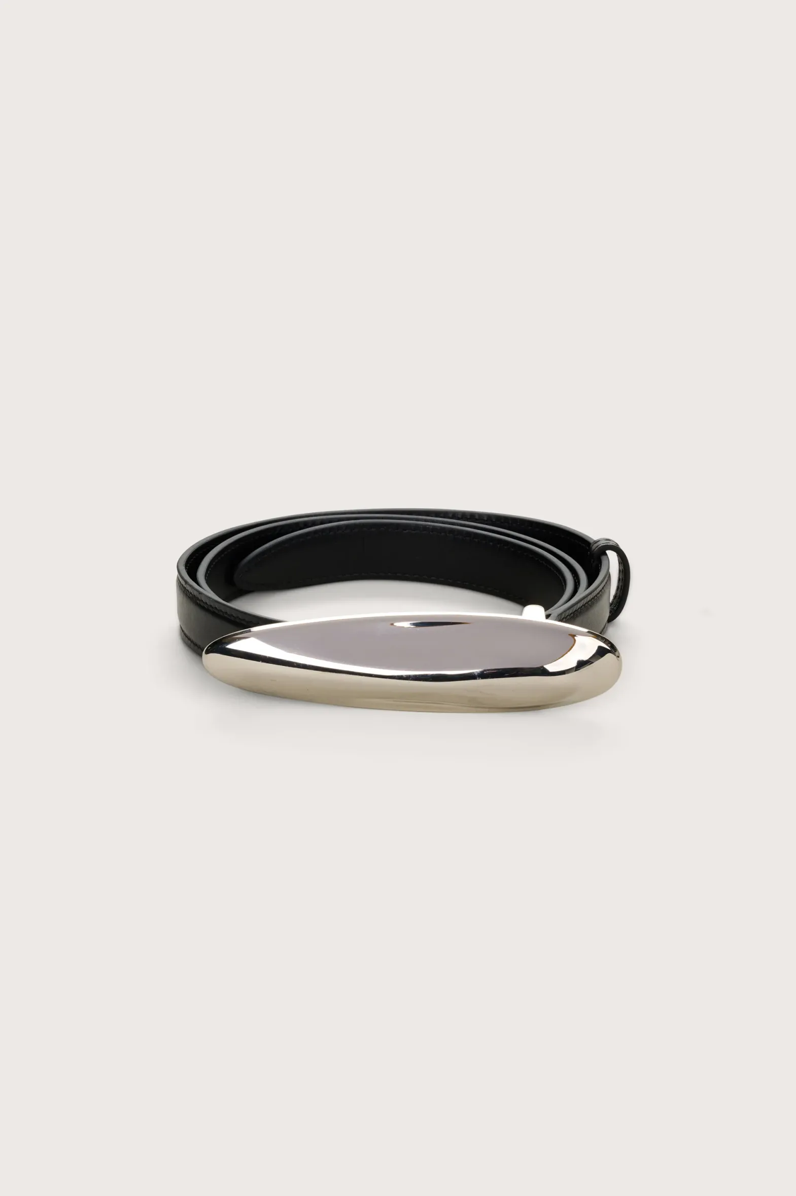 Thin smooth leather waist belt designed with shiny silver curved buckle.