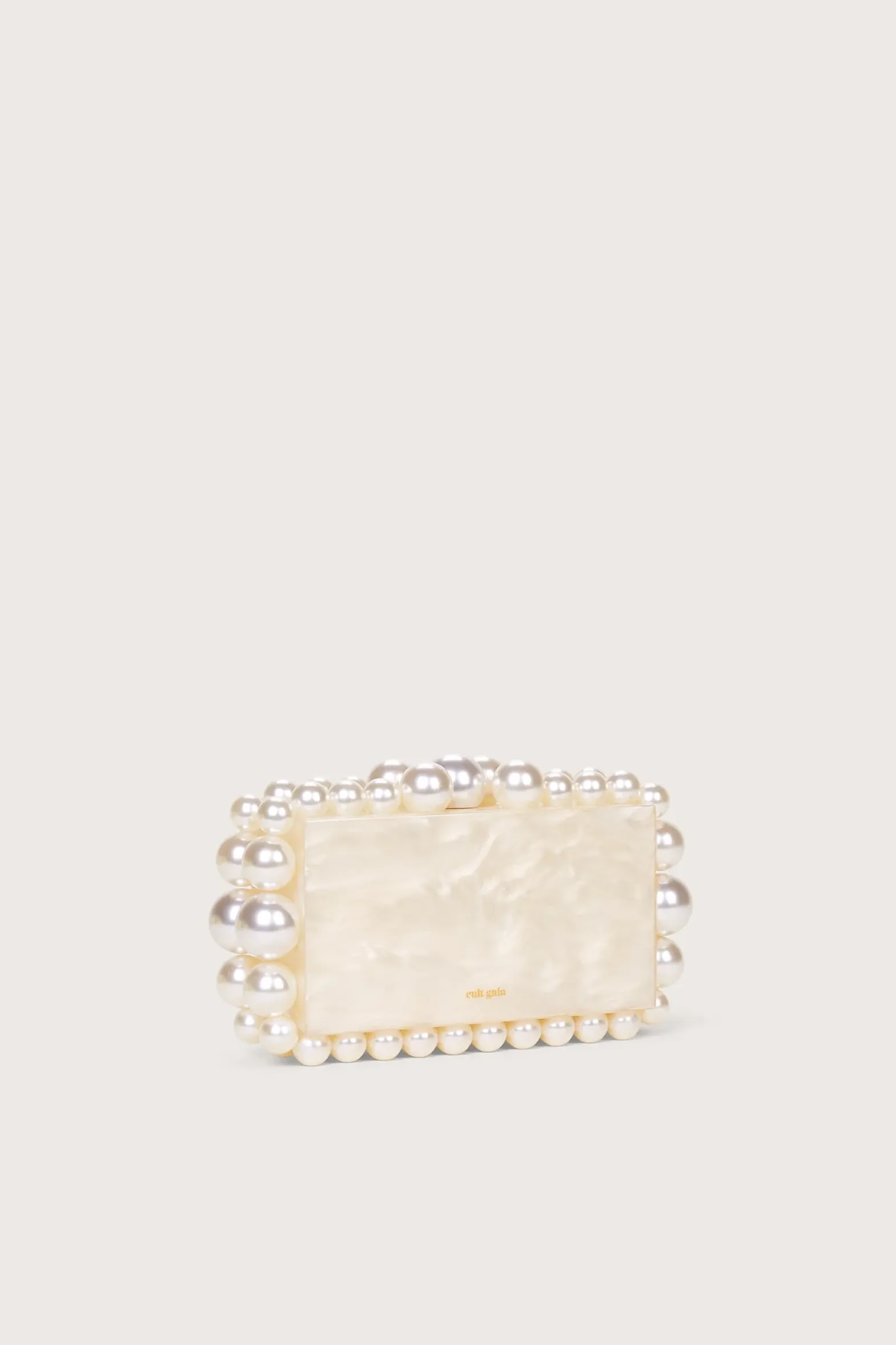 The Eos Box Clutch is an update from our loved Eos Box Bag. This clutch has beads surrounding the edges of the bag for a unique Gaia touch. Our classic Cult Gaia signature is printed in gold on one side of the clutch.