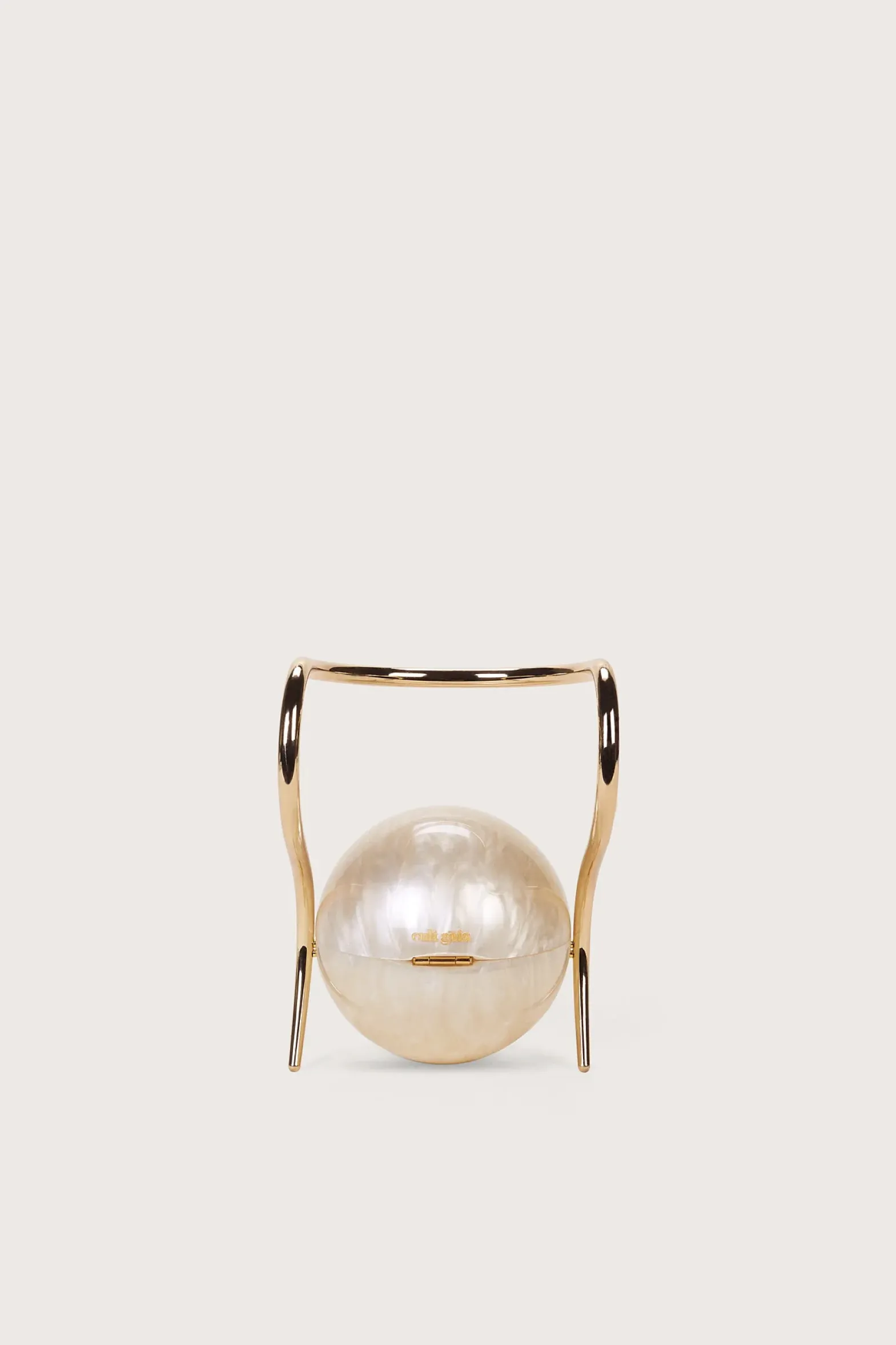 The Pearl Bag is a true Objet d’Art. This bag has a clasp open top, featuring a gold oblong handle. Wear this on your arm like a bracelet, or hold by hand.