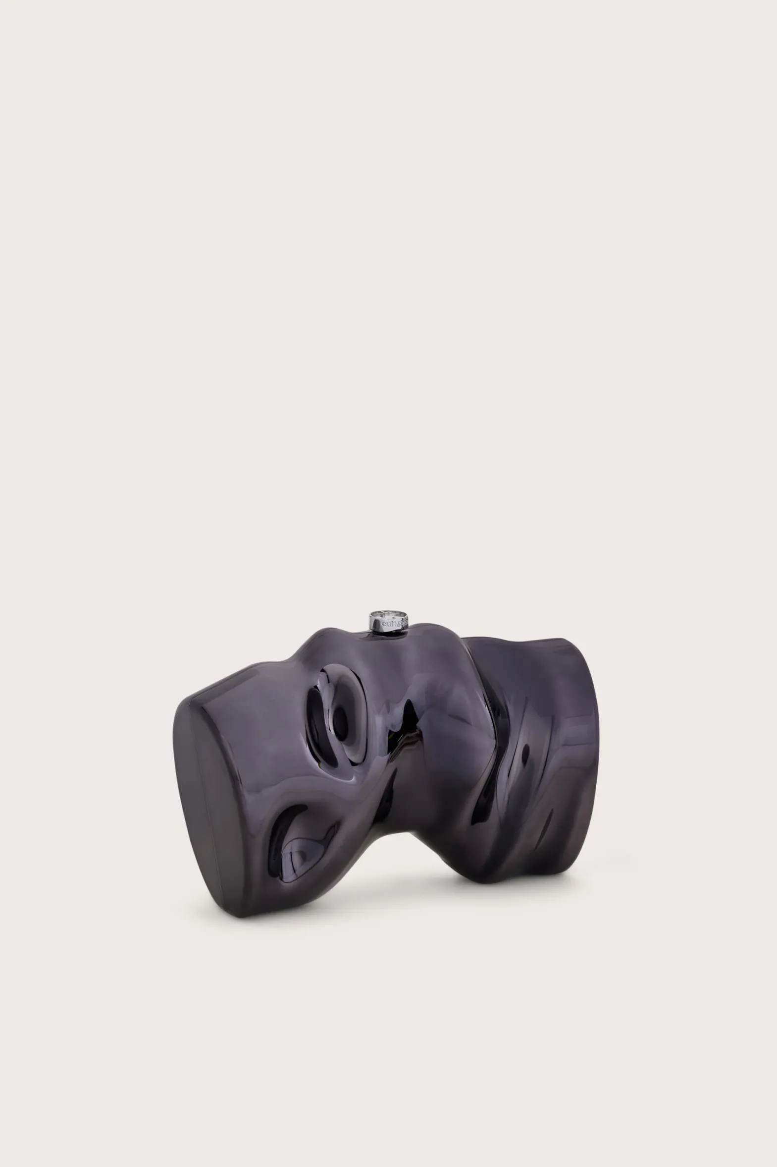 A molded scrunch shape forms the shiny metallic shell of this handheld clutch.