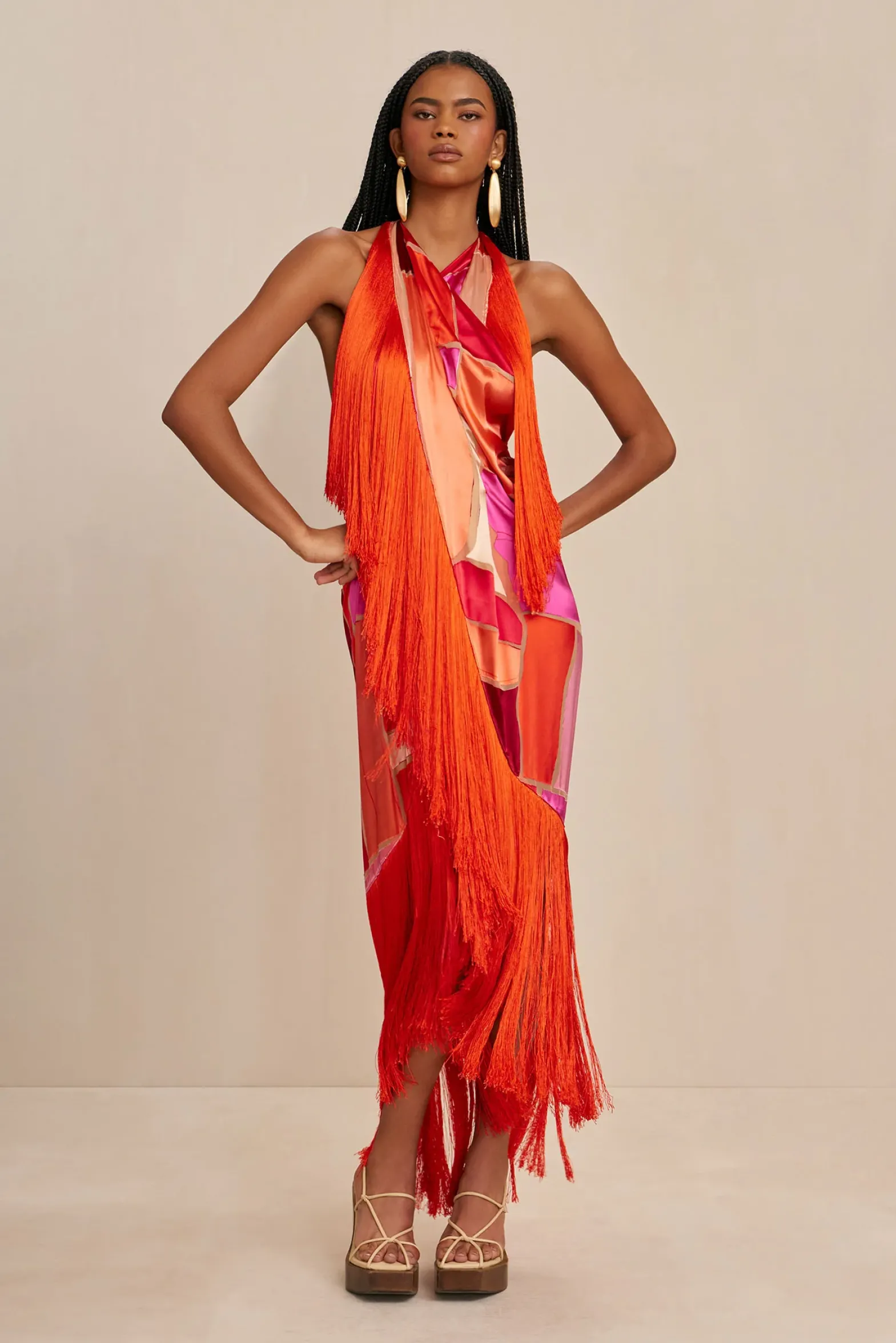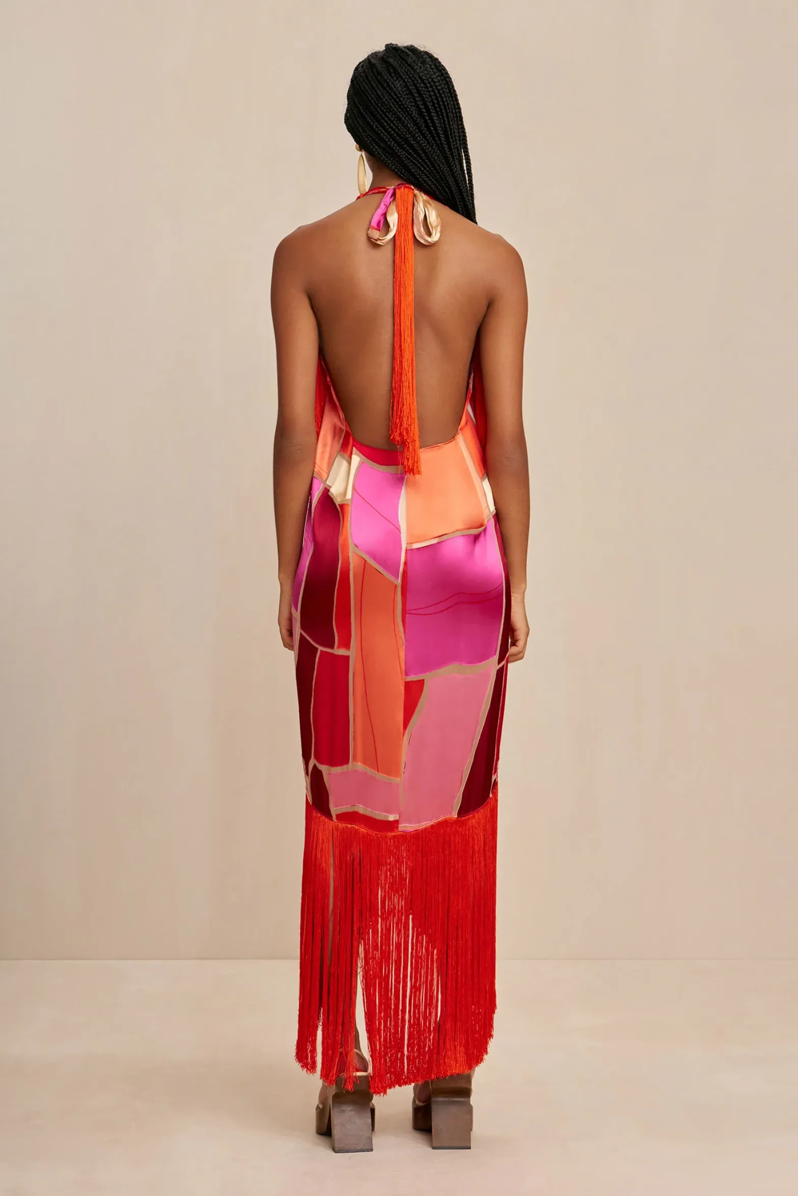 An overlapping layered silk dress with long fringe and an open back that ties behind the neck.