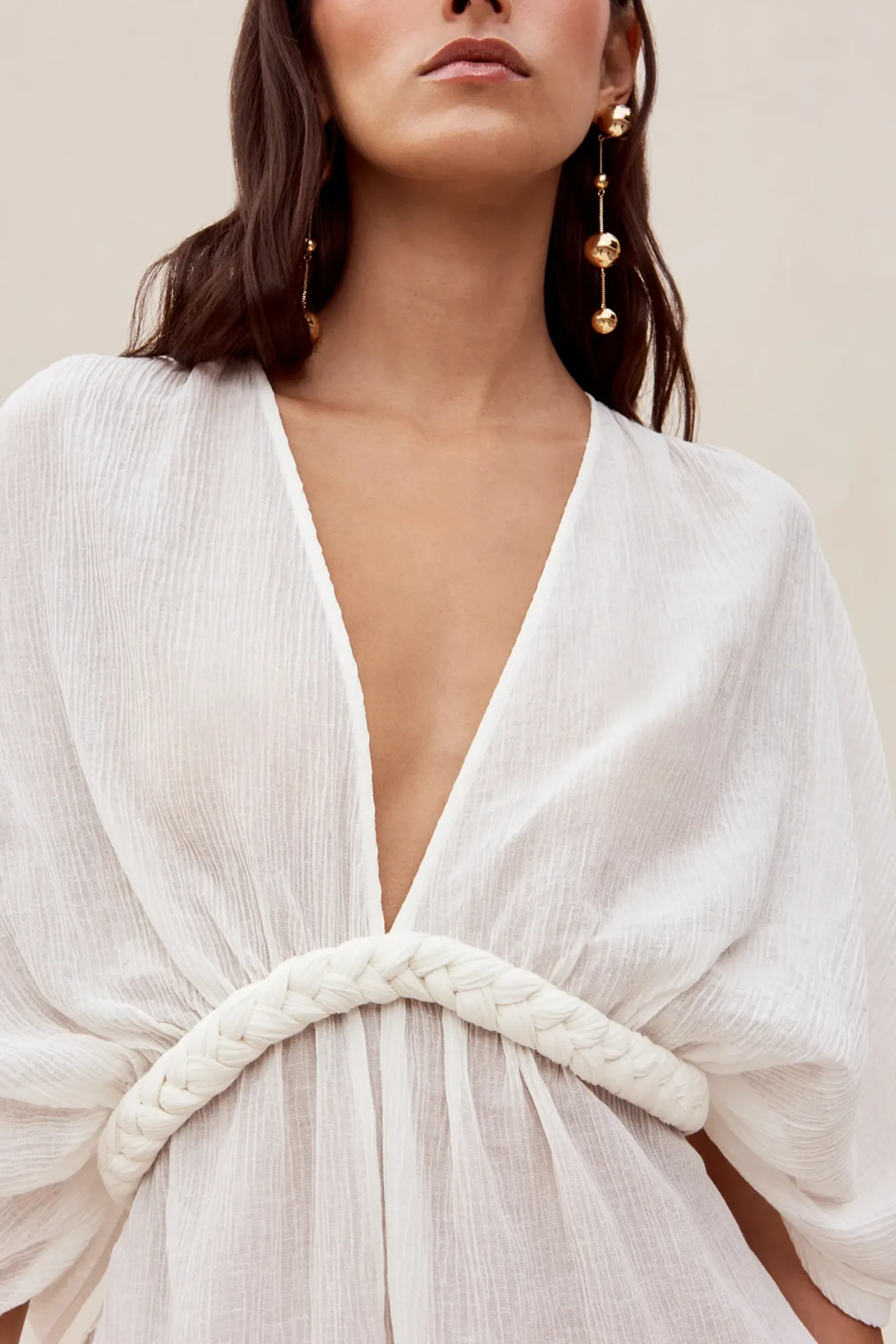 Inga is an ingenious coverup in a silk, linen blend. She has a plunging V-neckline and high side slits. A braided cord wraps from the front and ties in the rear. She exudes goddess vibes and is a must-have for this season.