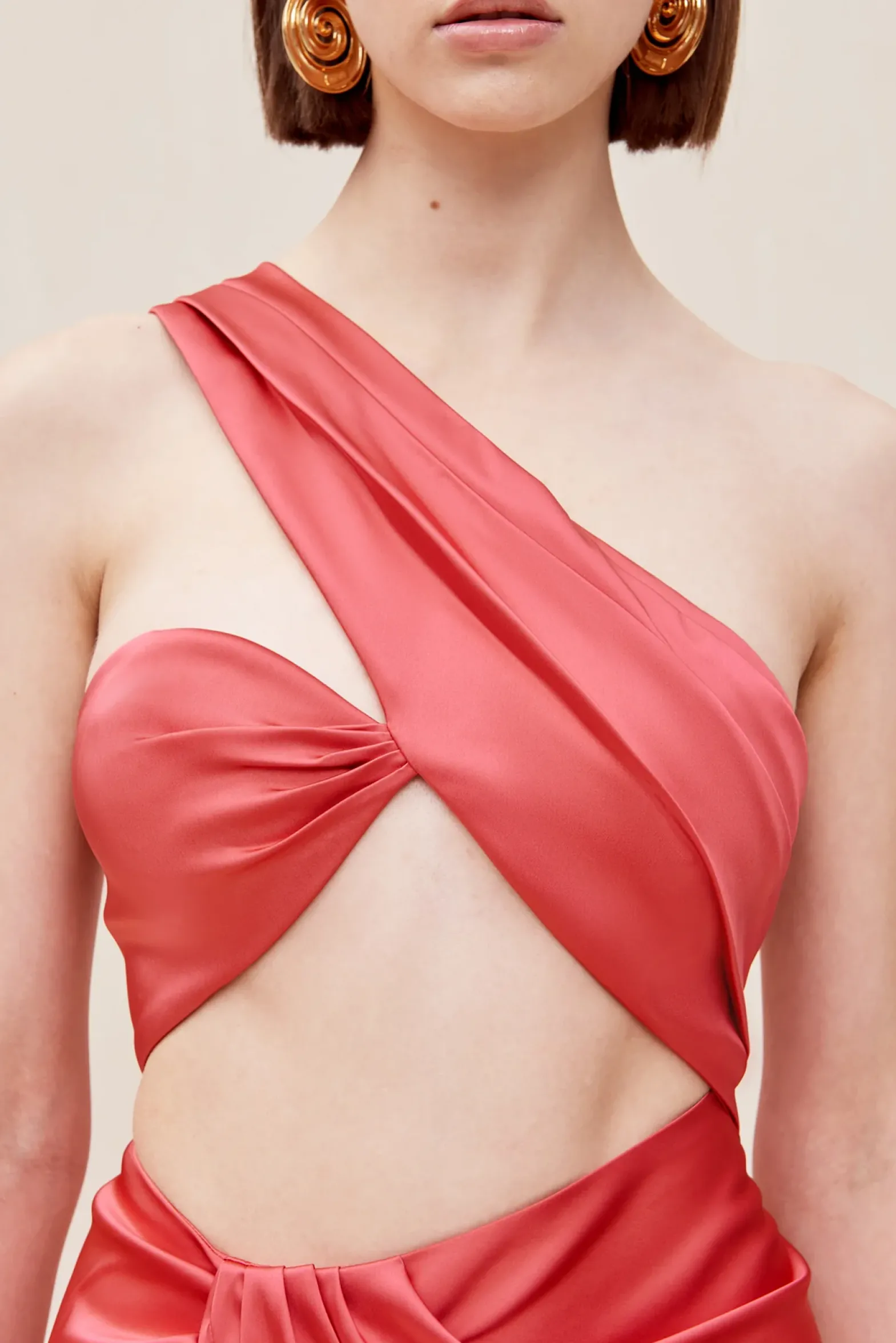 Avianna is an artistic piece at the intersection of asymmetry and classical silhouettes. This dress in Sunkiss hues is lined in the upper body and is slightly stretchy. The over the shoulder band holds you snug. A gathering of fabric at the waist drapes down the front to provide movement and texture. A side zip allows for east wear.