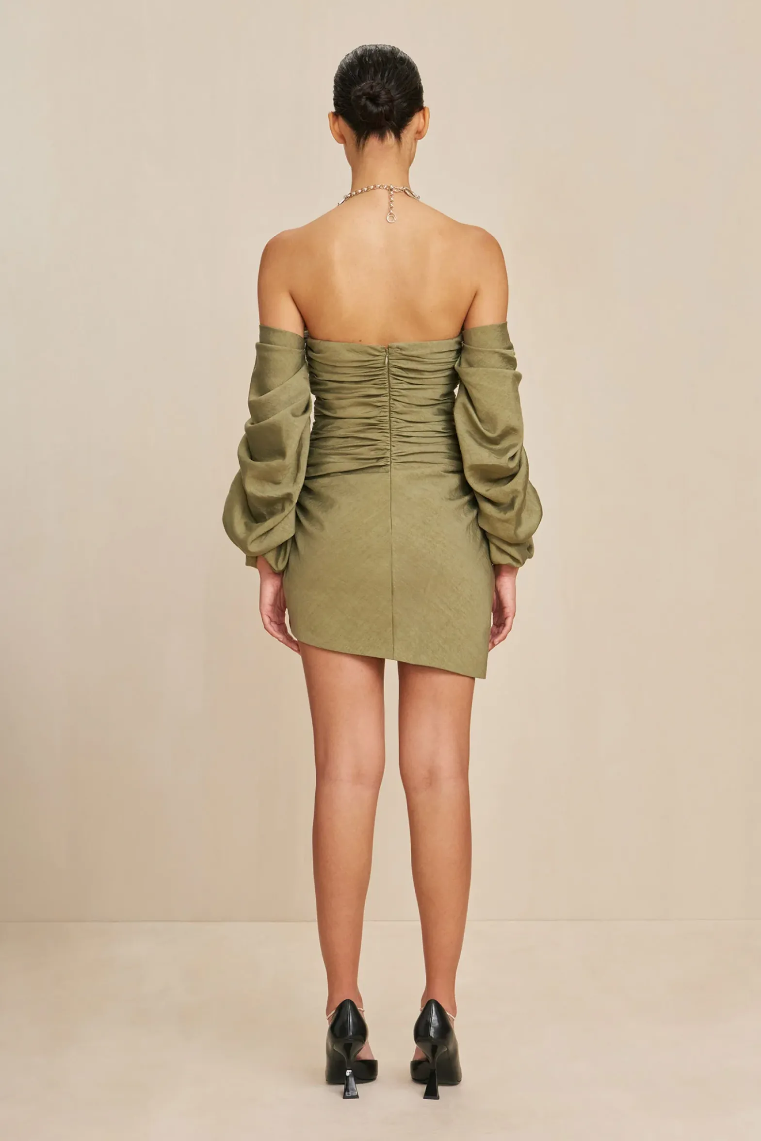 A gathered strapless mini-dress with exaggerated sleeves.