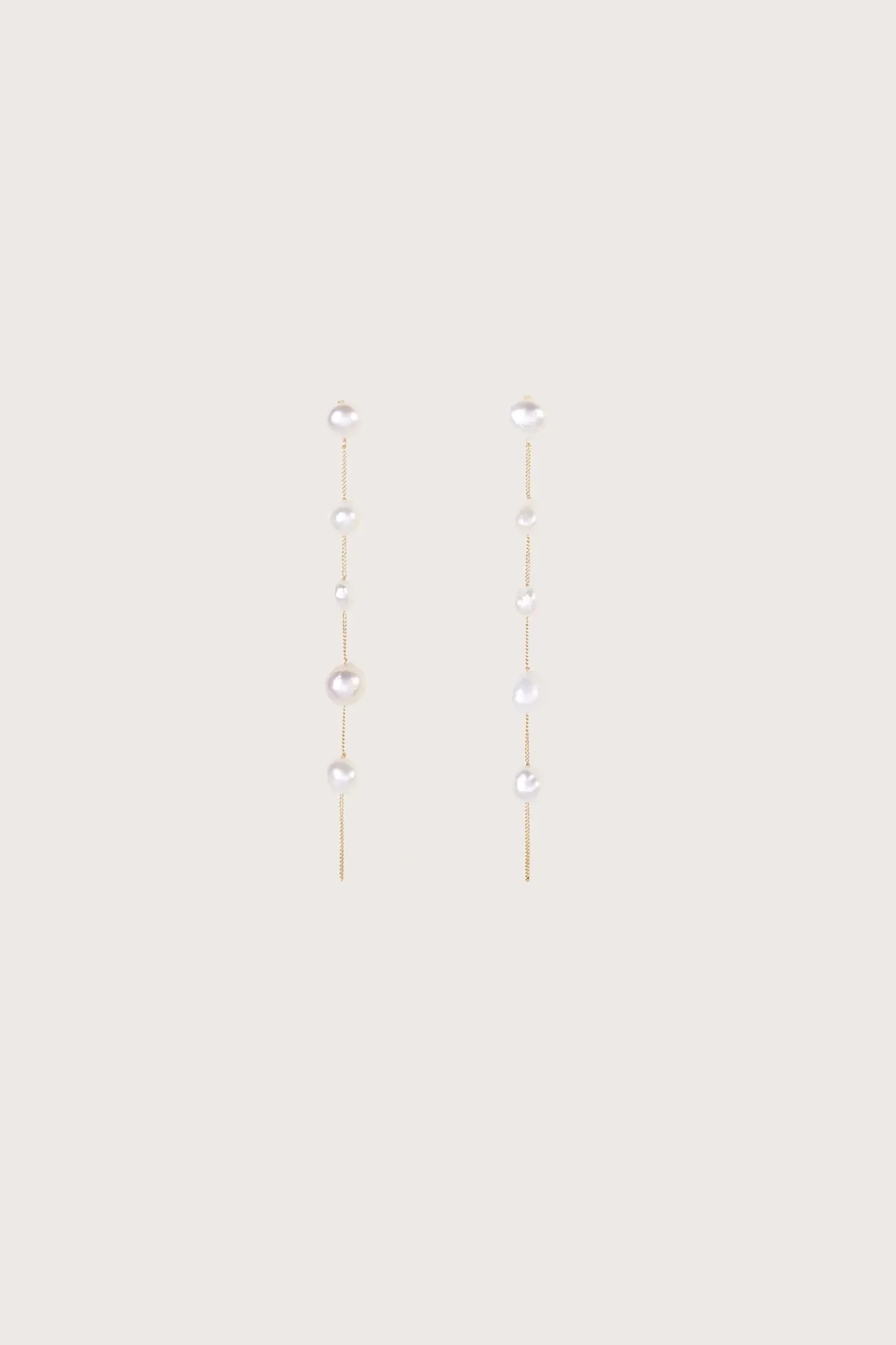 The Atum Earring has a stunning collarbone-grazing silhouette cast from brushed brass dotted with lustrous freshwater pearls. One of a kind, no two are alike.