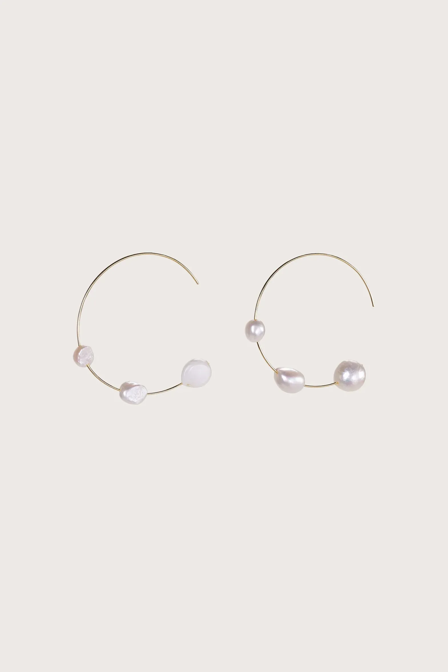 Nubia doesn’t need an introduction. This stunning earring is composed of the most elegant, thin gold-toned brushed brass hoop that’s been adorned with three, real baroque pearls. Natural shapes meet minimalistic lines to create this gorgeous 2” diameter earring. Increasing in size, the three pearls seem to cascade down the hoop and make a bold statement with effortless grace.