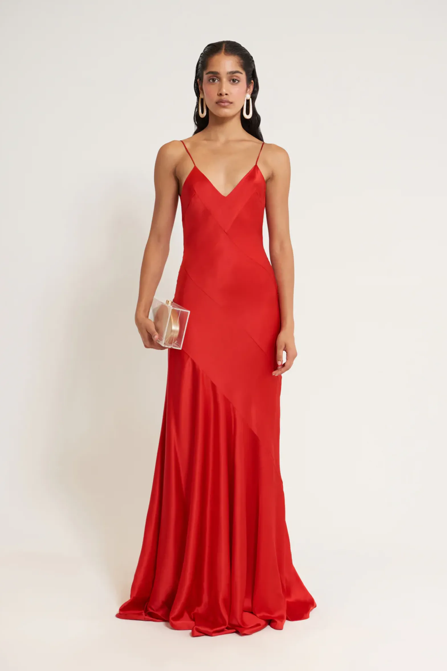 The Crissy gown is floor-length in Ghermez air satin. The rose-hued silky material enriches movement and demands attention. The gown is embellished with bias-seam detail to flatter the feminine figure. Two thin straps delicately connect across the shoulders and are balanced by the gorgeous excess of the skirt.