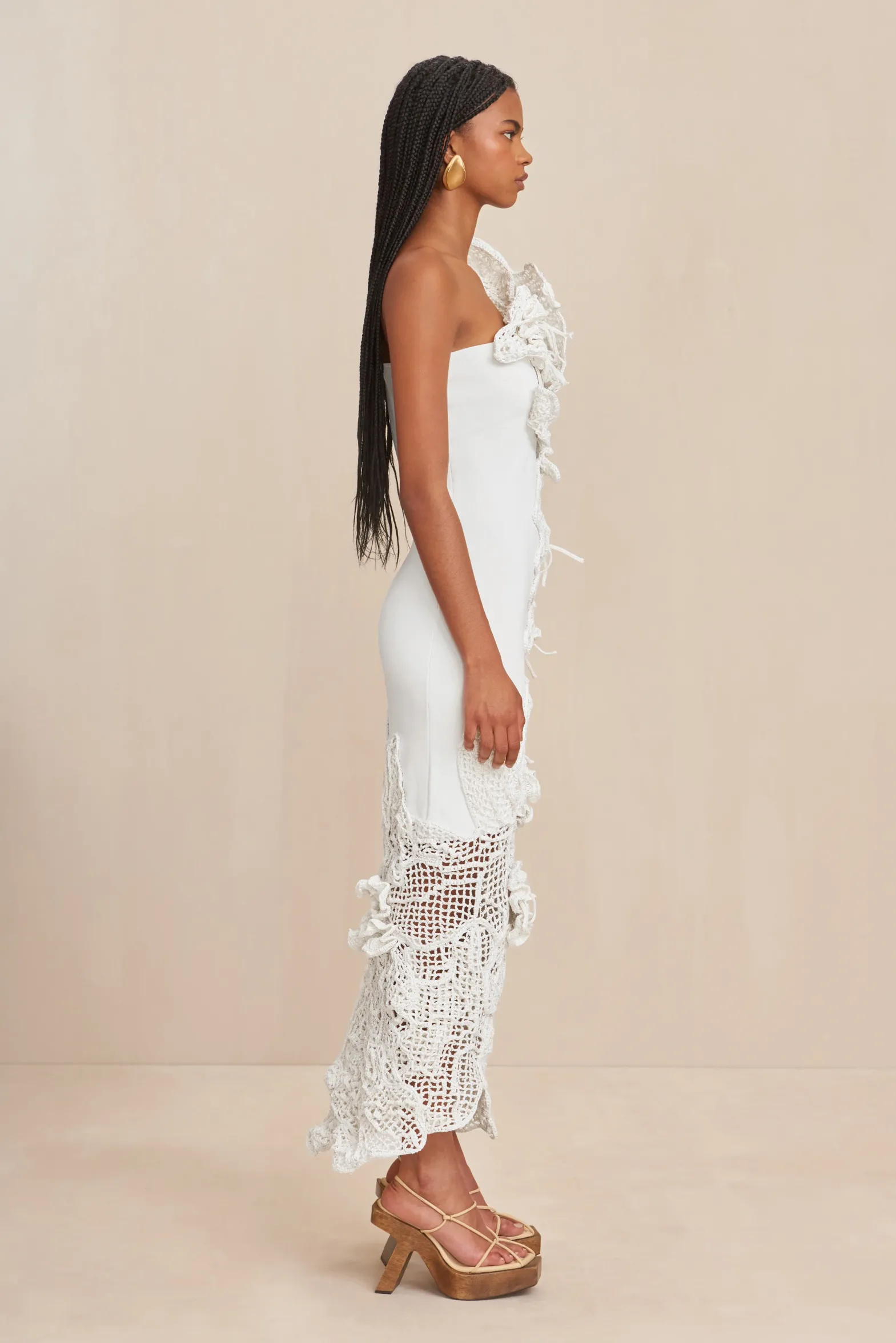 A hand-crocheted, ankle-length gown with large, three-dimensional knit floral motifs.