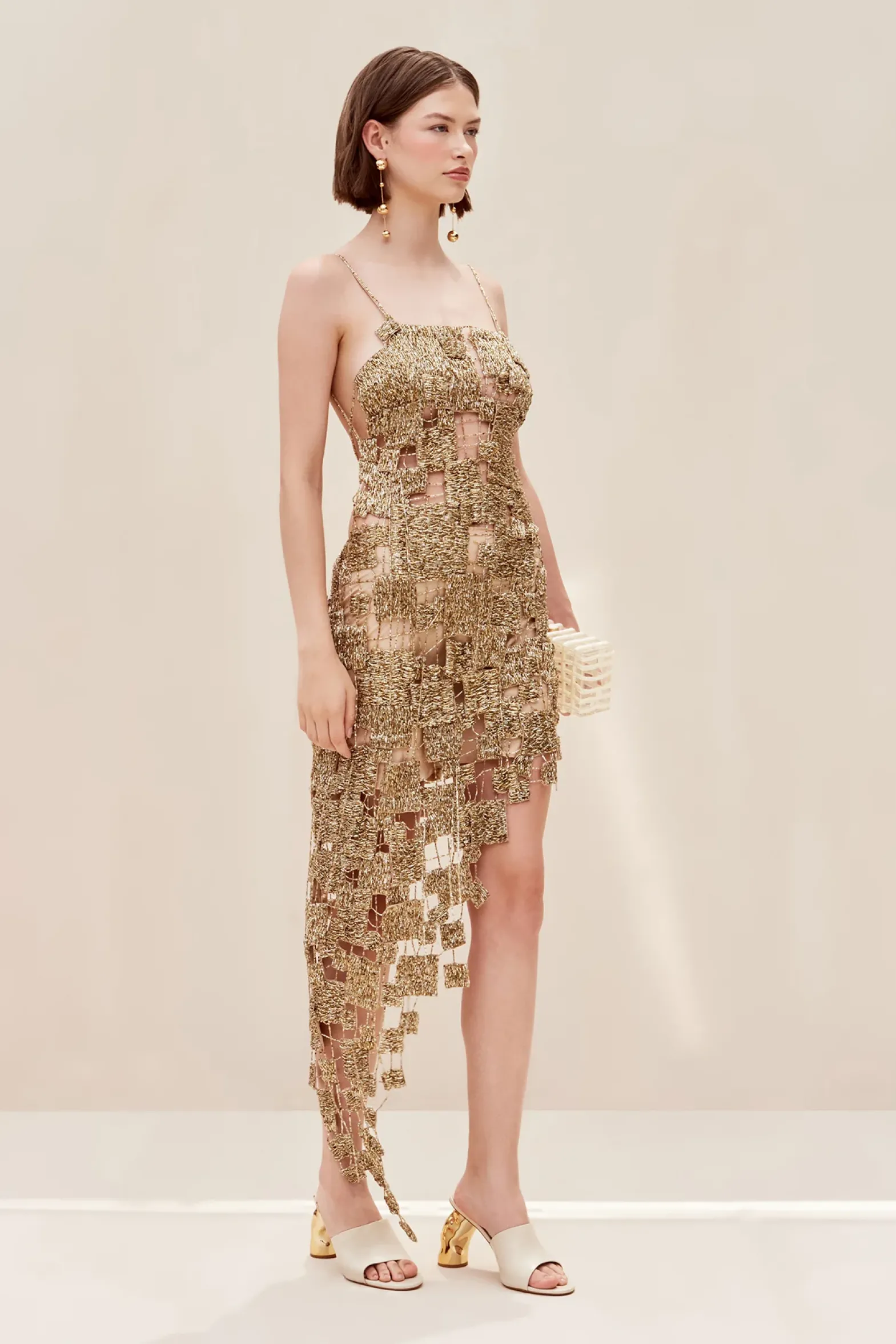 Lyana is a hand-beaded patchwork gown that shines through its artisanal craftsmanship. Hand-placed beaded panels are connected by beaded strings over a discrete lining. This dress provides elegant transparency and coverage. Her irregular hem compliments the organic patchwork.