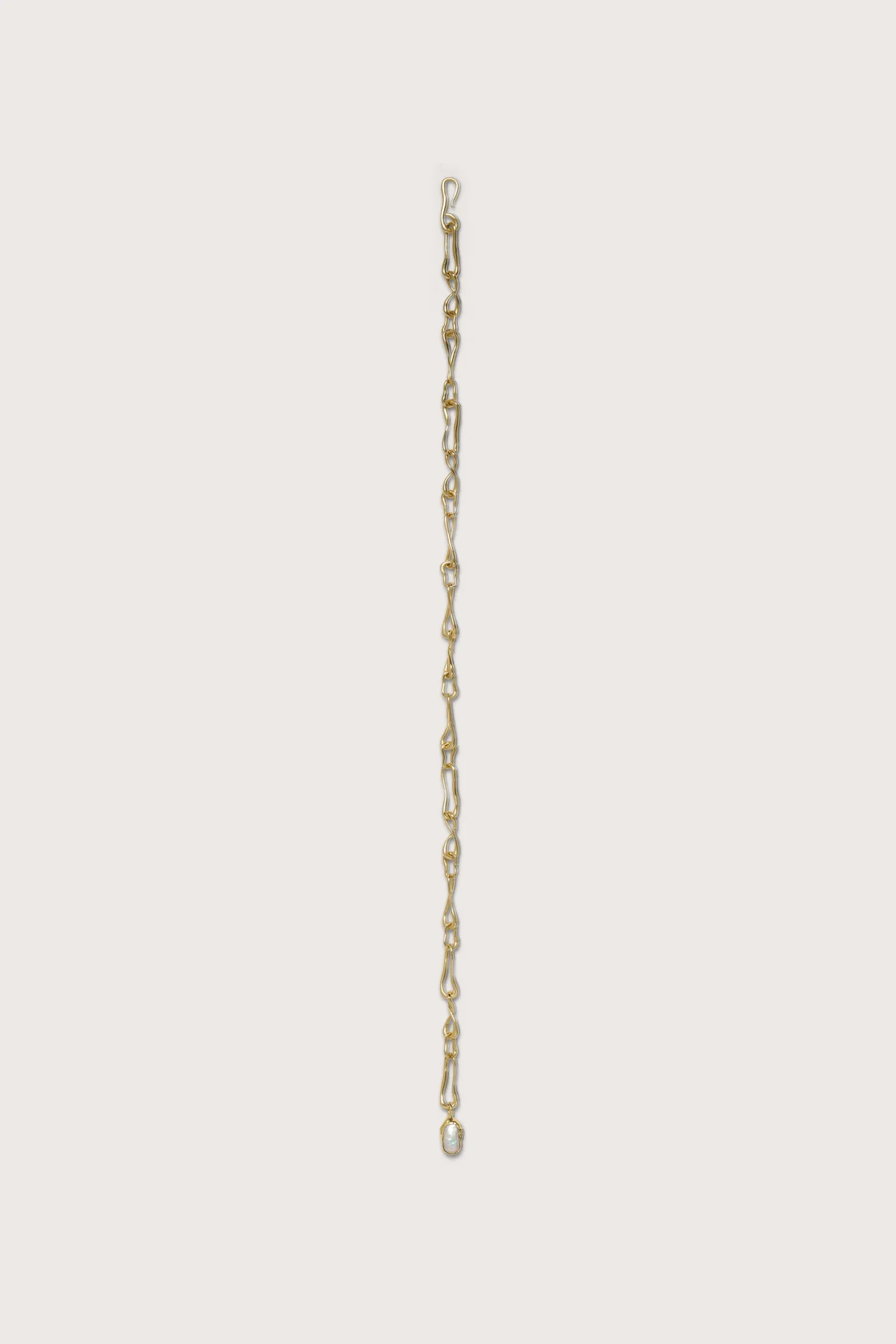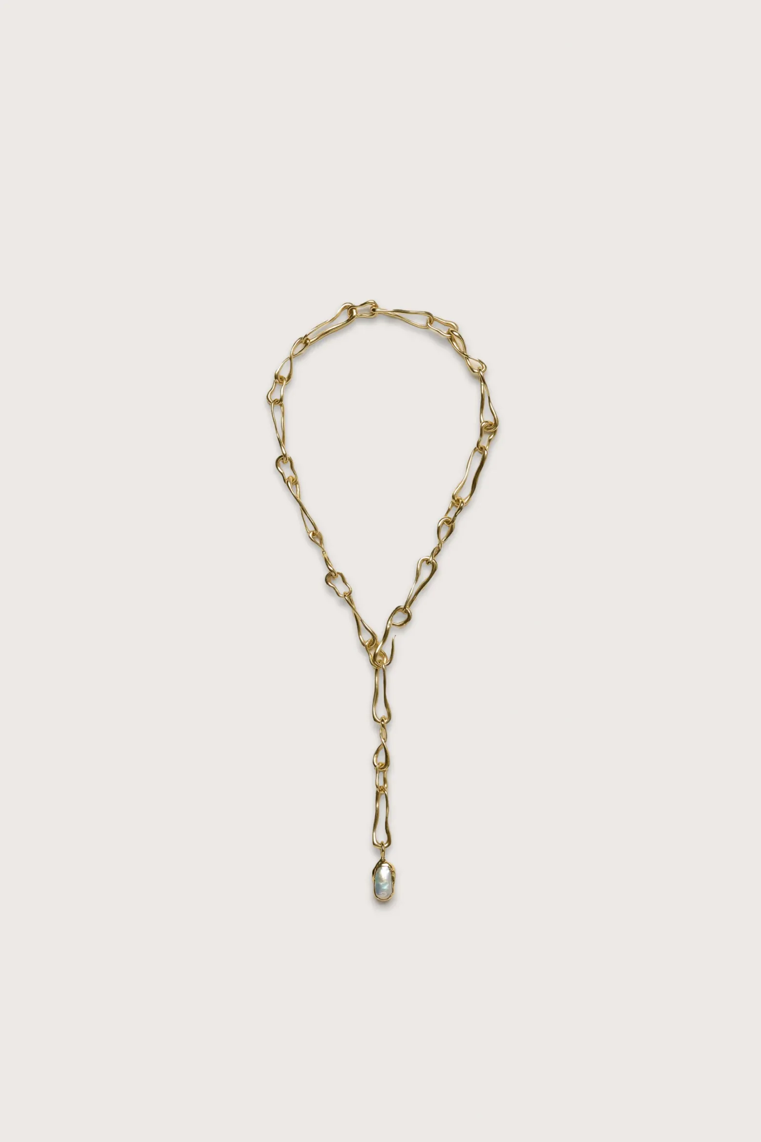 Irregular chainlinks connect this pendant style necklace featuring a glass-imitation pearl at the center.