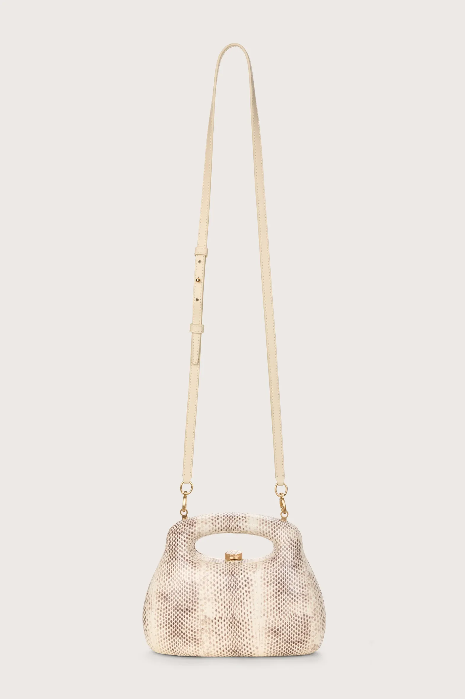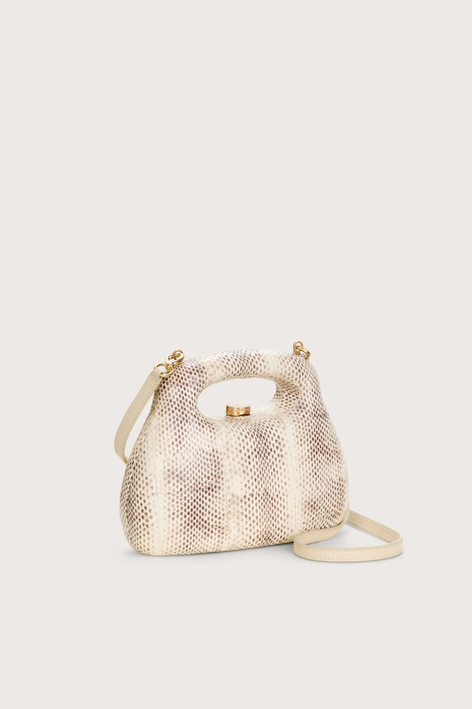 A stamped snakeskin leather mini handheld bag.
