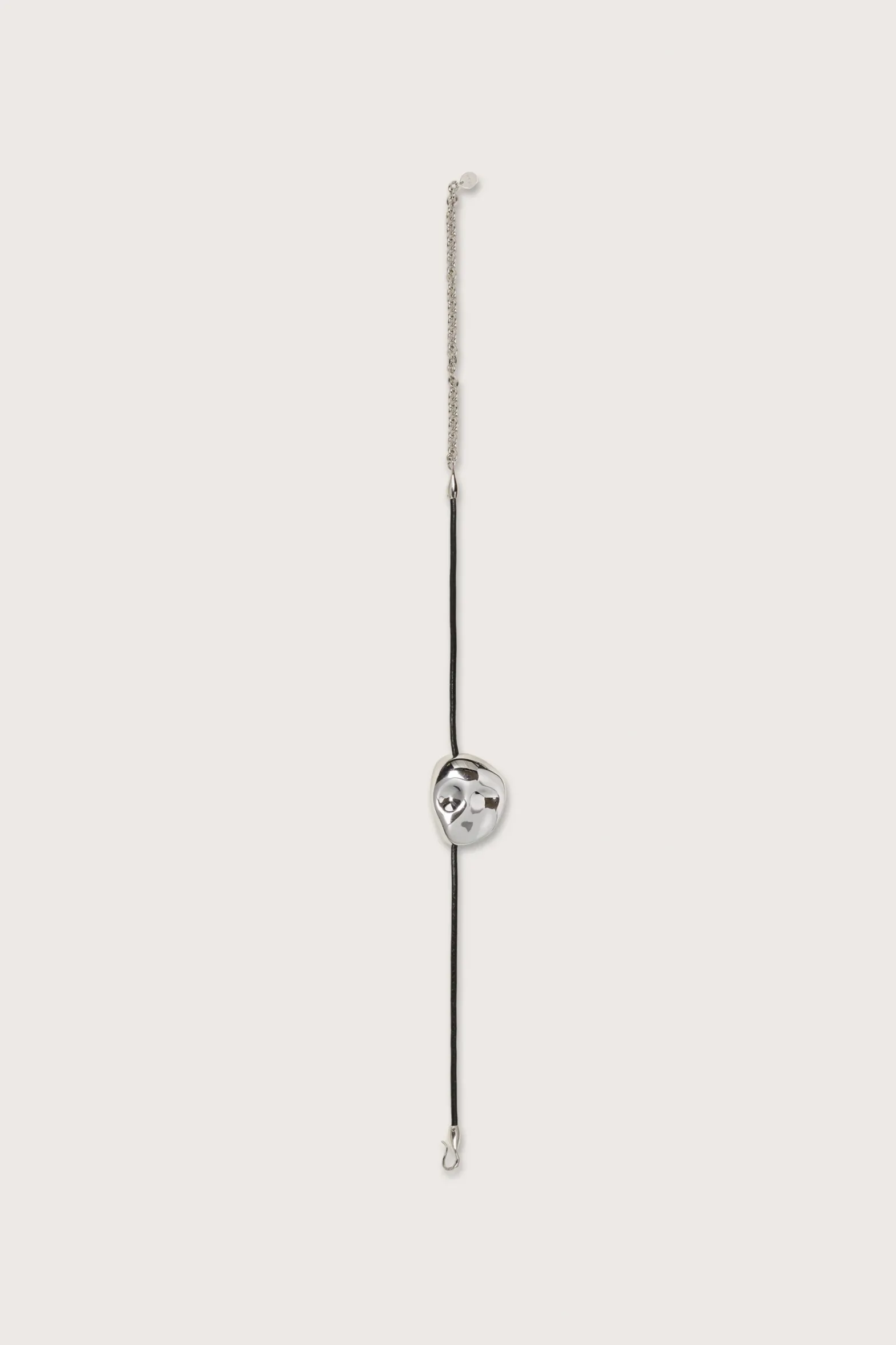Silver toned molded rock shape sits at the center of this smooth leather cording choker.