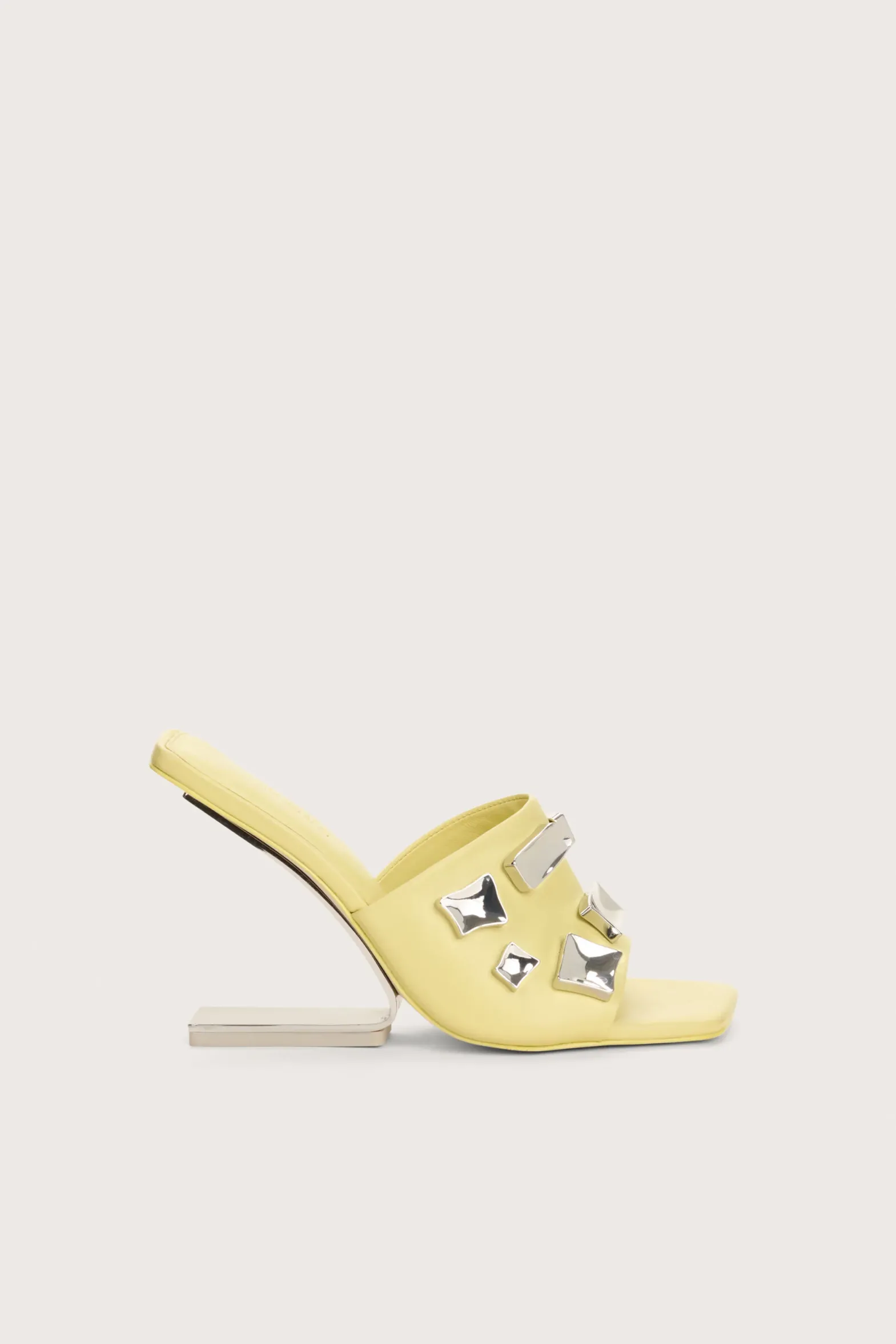 Malaya is a masterpiece balanced on an illusion heel. She features a leather exterior in vibrant Lemon sorbet. Reflective, high-shine hardware adorn her foot strap. Pair with the Malaya Anklet to enhance the effect. She will enchant your entourage.
