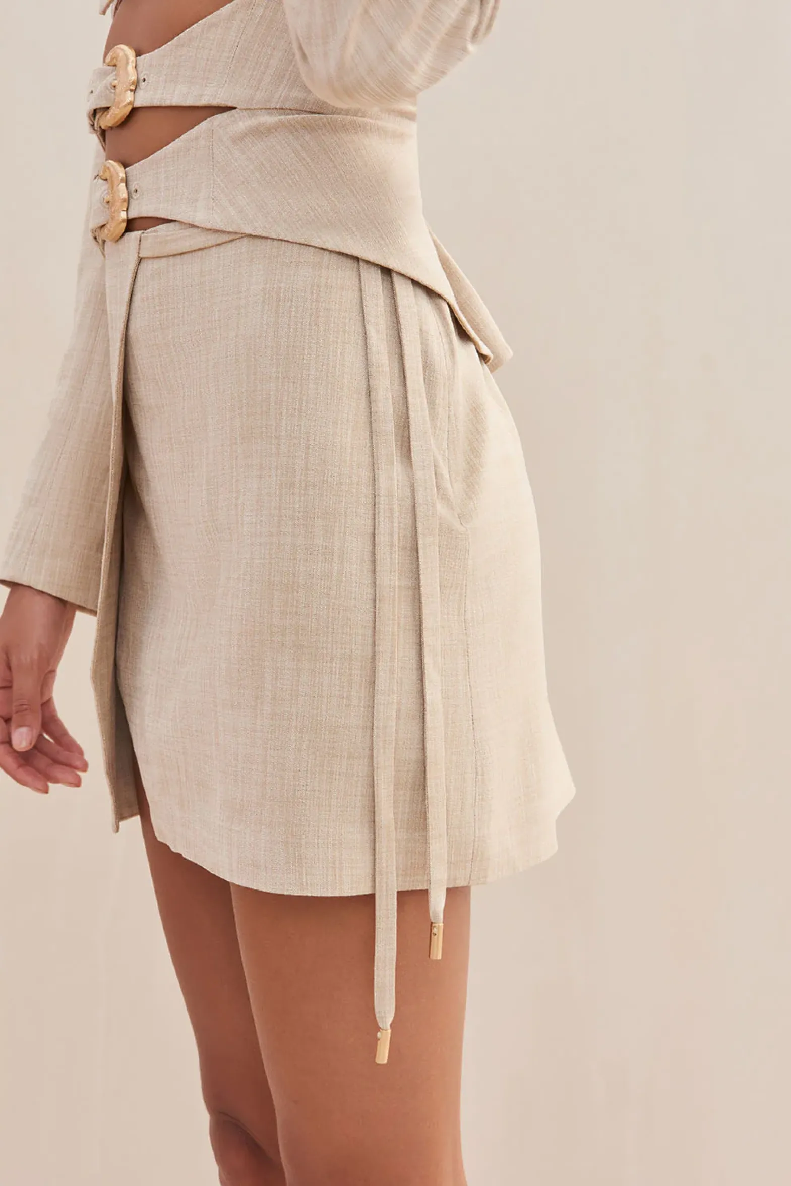 The Sammy Skirt adds some angles to your look with a diagonal slit over the left leg. Ties at the right gives an elegant, dangling accent. The high waist and mini-hem is ultra-flattering to your figure.