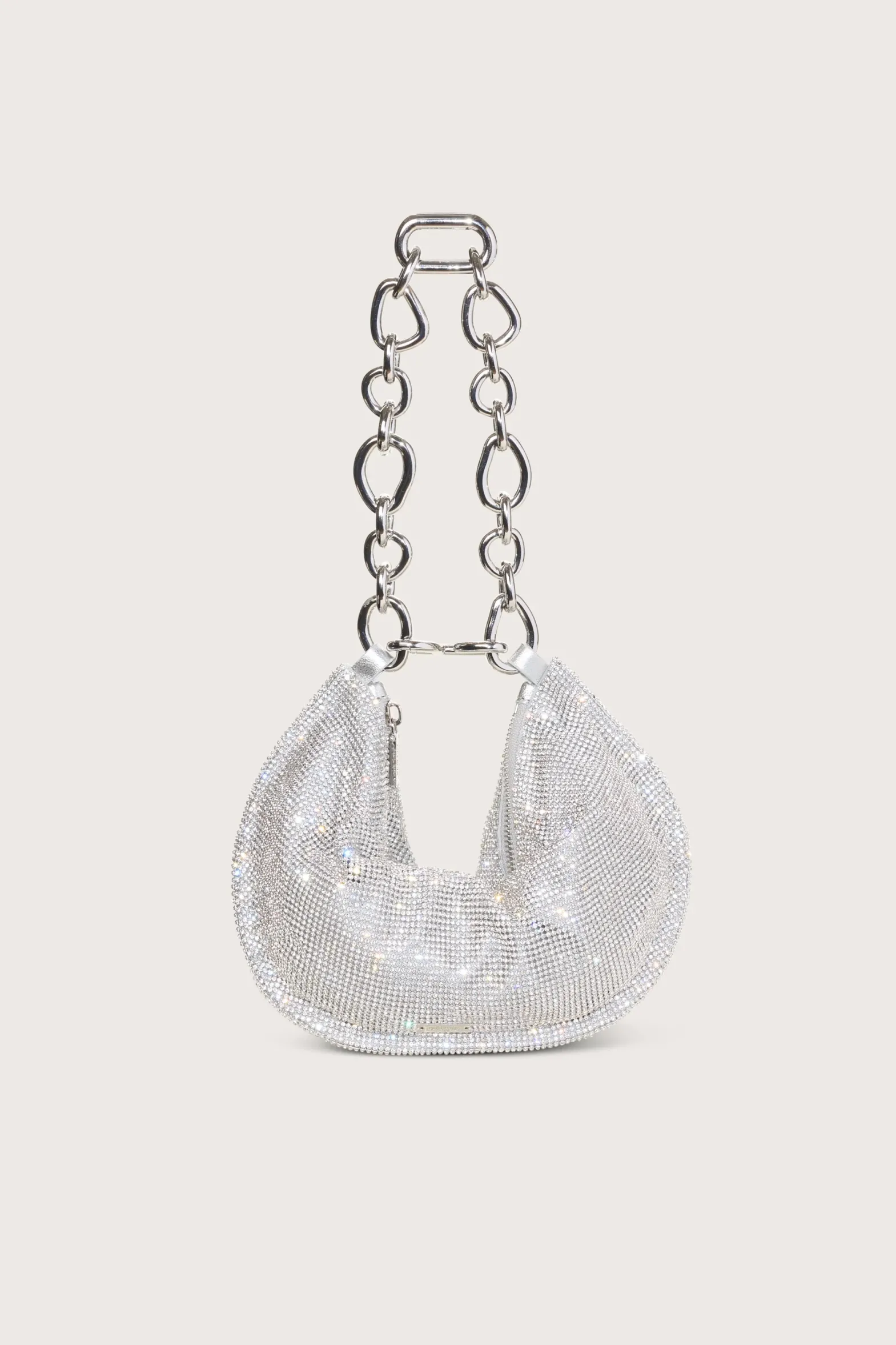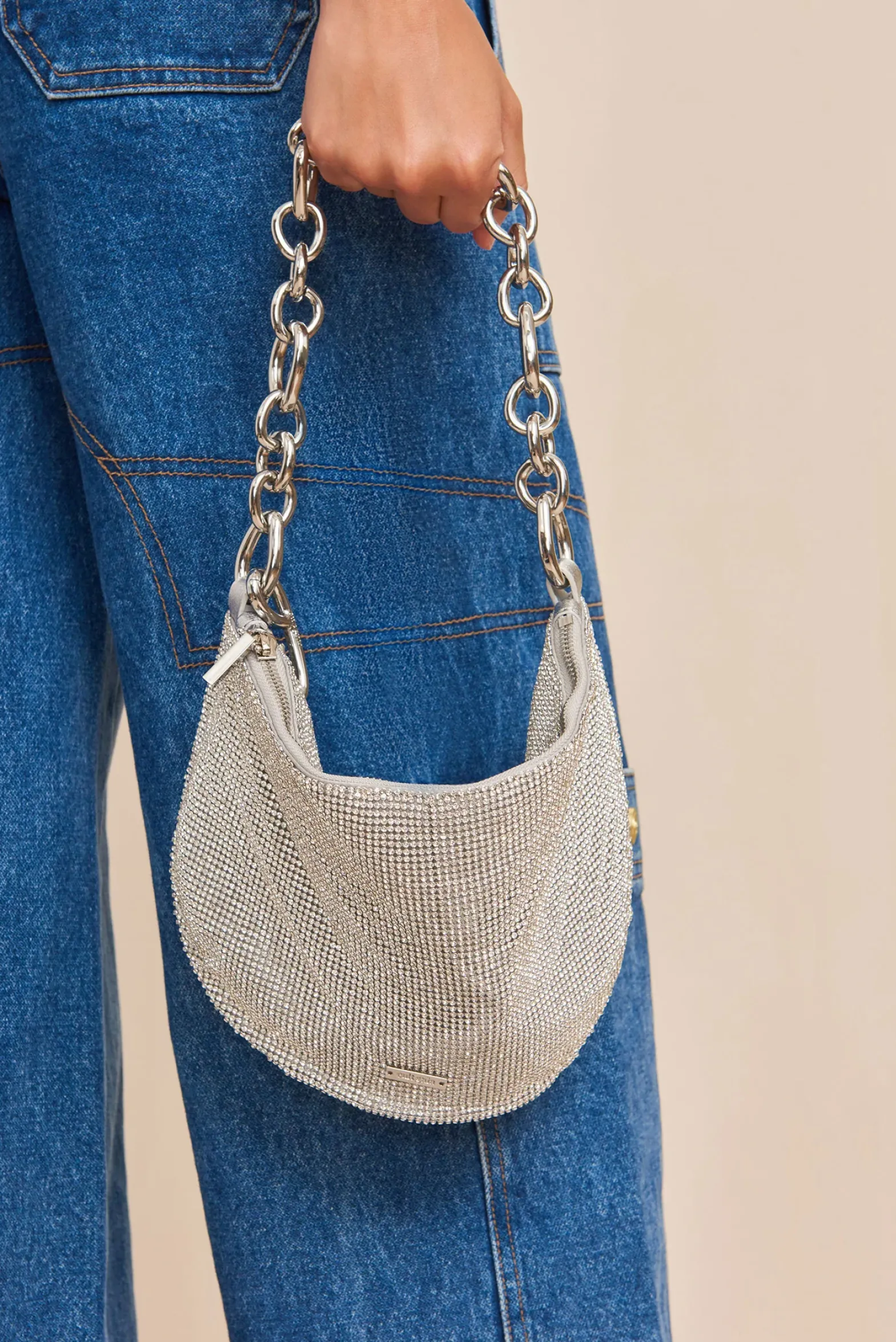 A half moon shaped mini shoulder bag featuring clear rhinestone mesh body and shiny silver-toned chain-link shoulder strap.