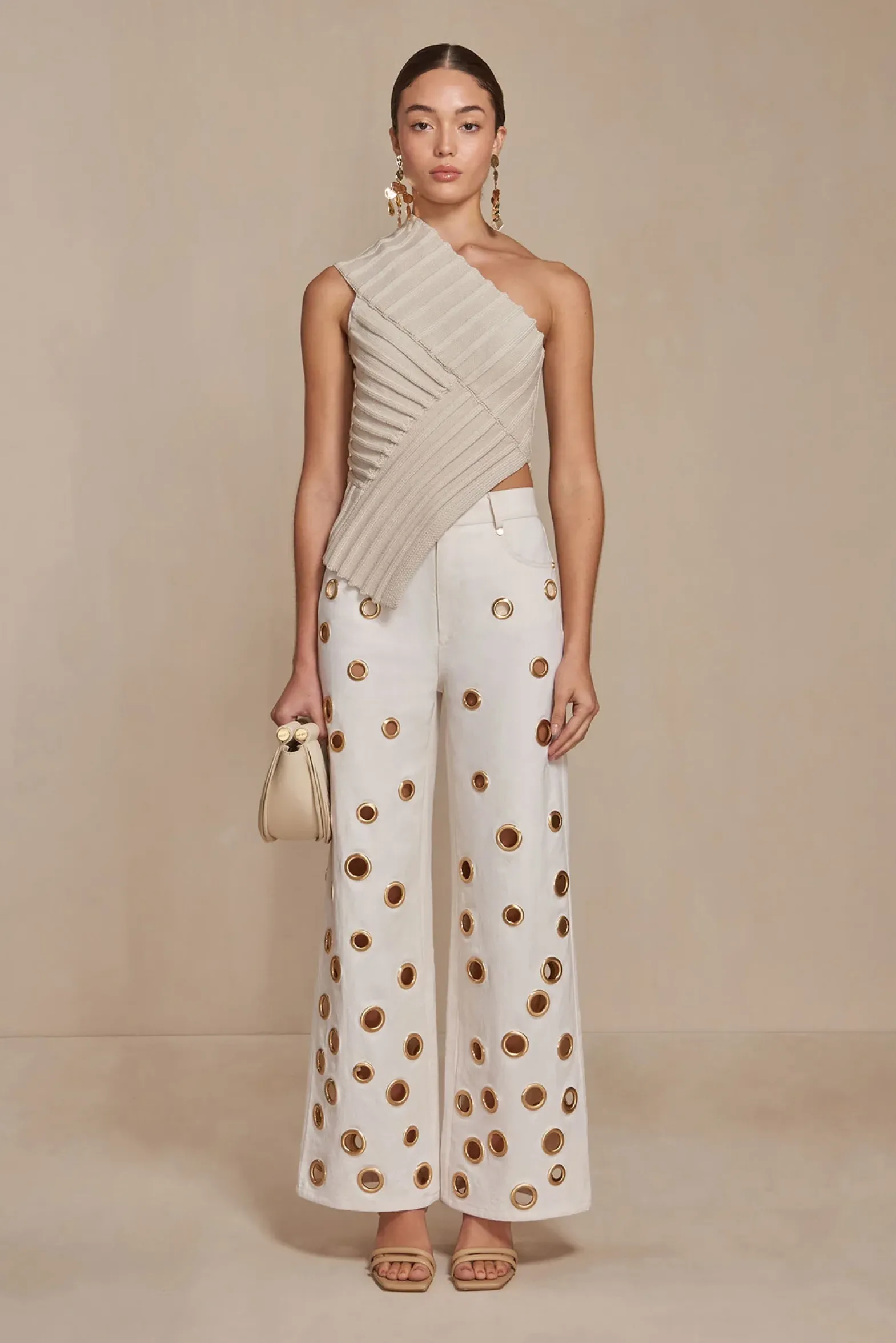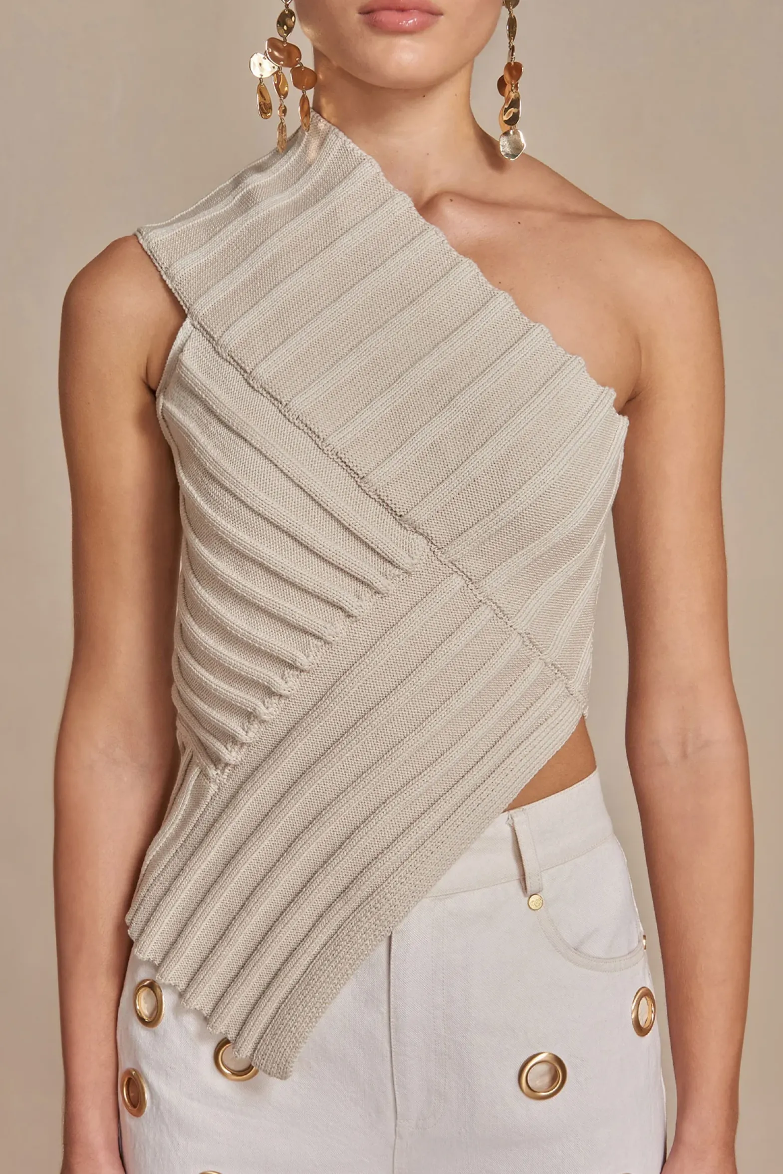 The modern, colliding angles of the Del Top are designed to create an ultra-flattering silhouette. A contrasting band extends from the waist up and over the right shoulder, while the left shoulder is exposed. Thoughtful cutouts and angular ribbed knit patterns add a hint of flair to this transitional knit wardrobe staple.