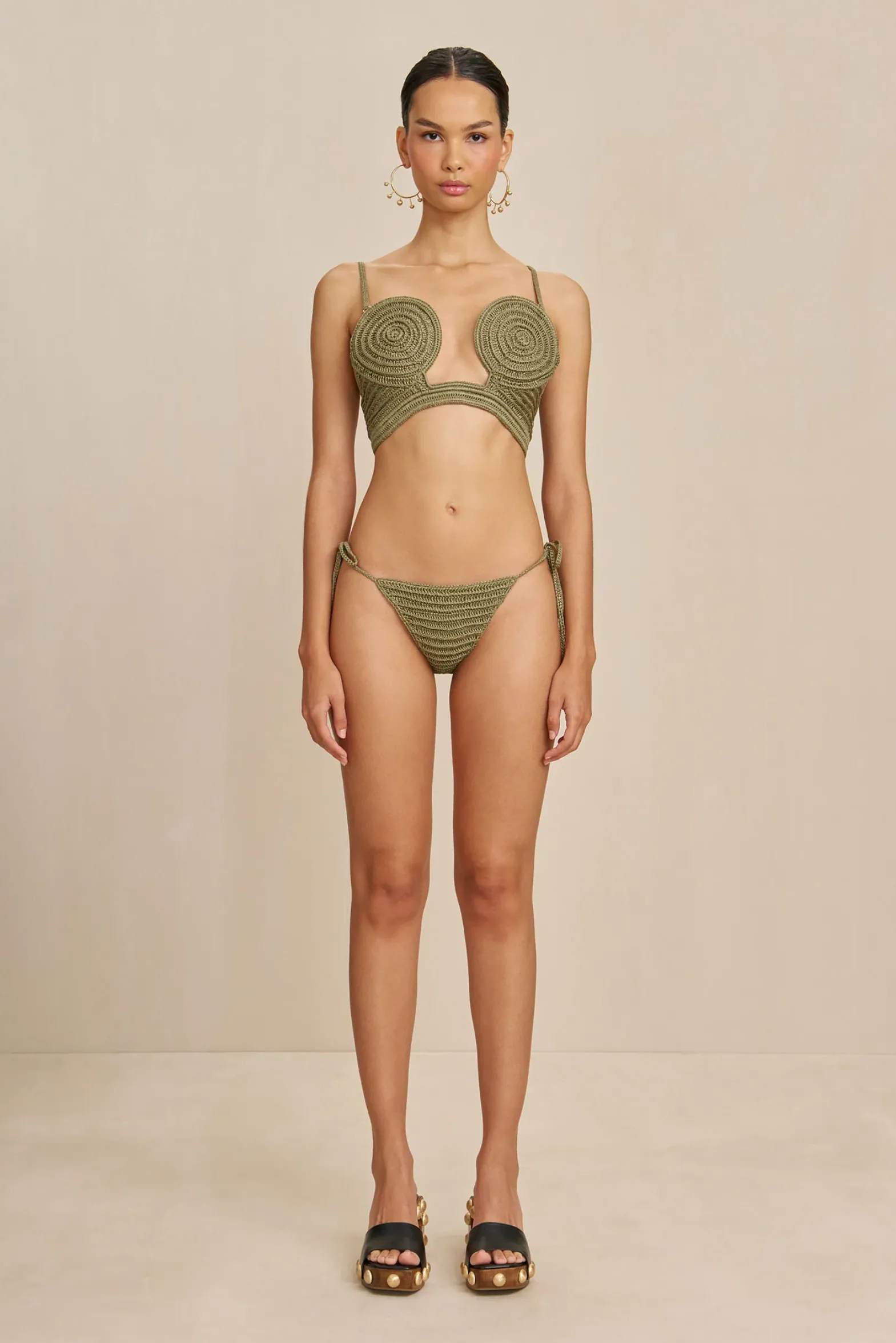 A hand-crocheted raffia bikini top with form-flattering, geometric knit.
