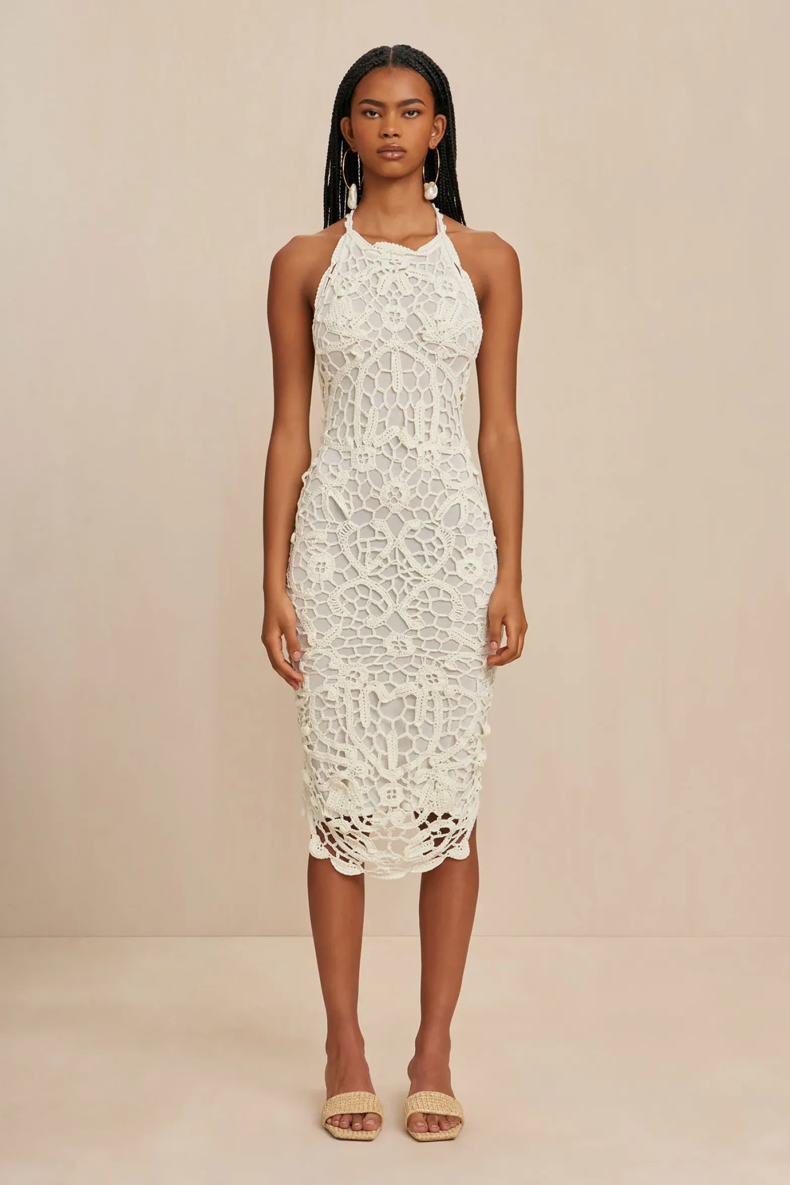 A hand-crocheted, knee-length dress with symmetrical floral and geometric designs and an irregular hem.