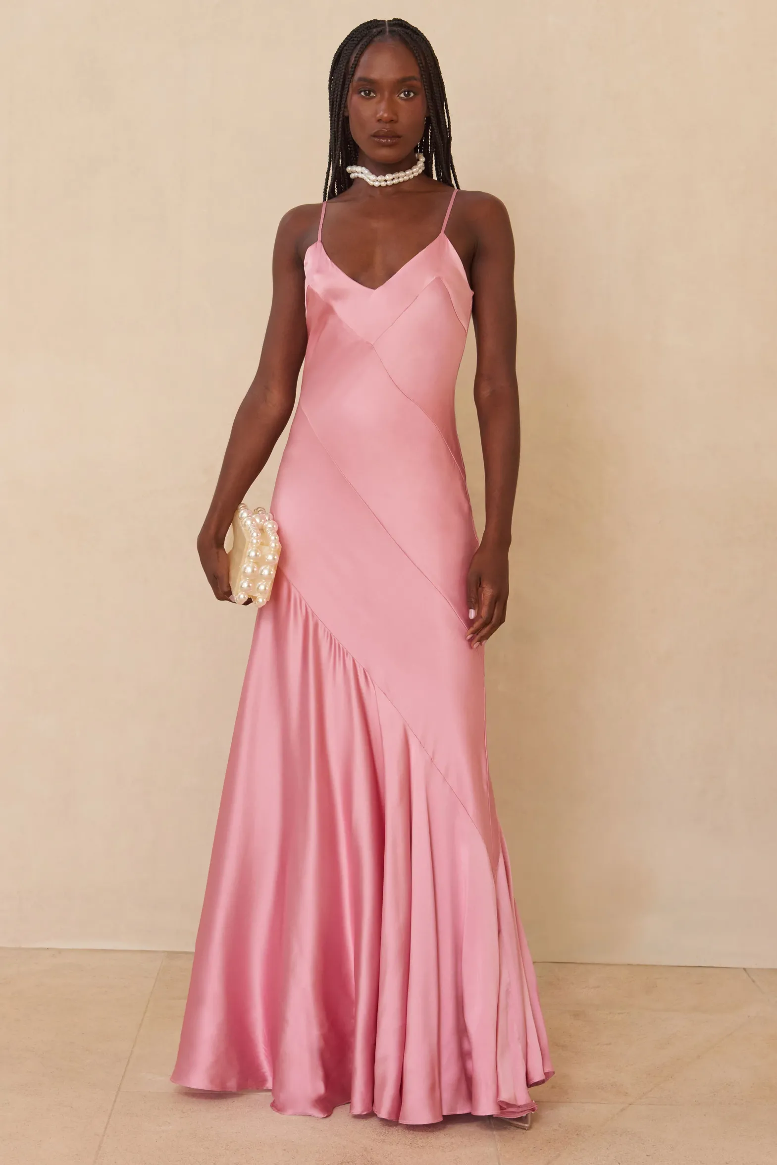 Make an entrance. The Crissy is a floor-length gown in Shell Pink air satin. This blush-hued fabric is embellished with bias-seam detail to flatter the feminine figure. The material enriches movement and demands attention. Consider pairing with the Paola Jacket for a truly unforgettable look that combines flamboyance with elegance.