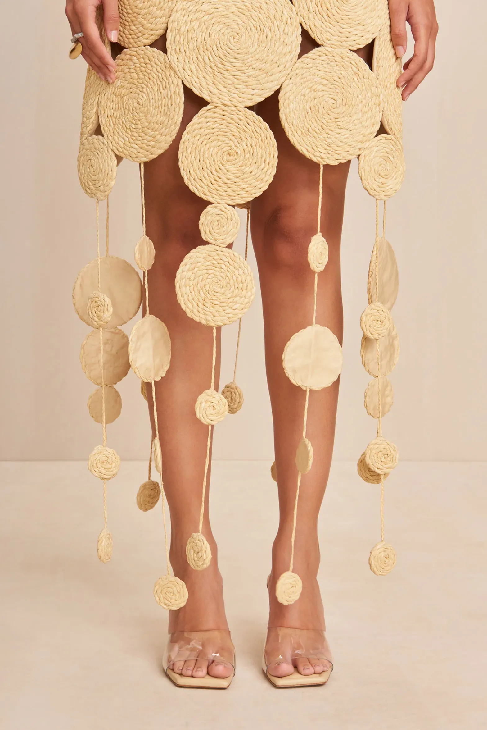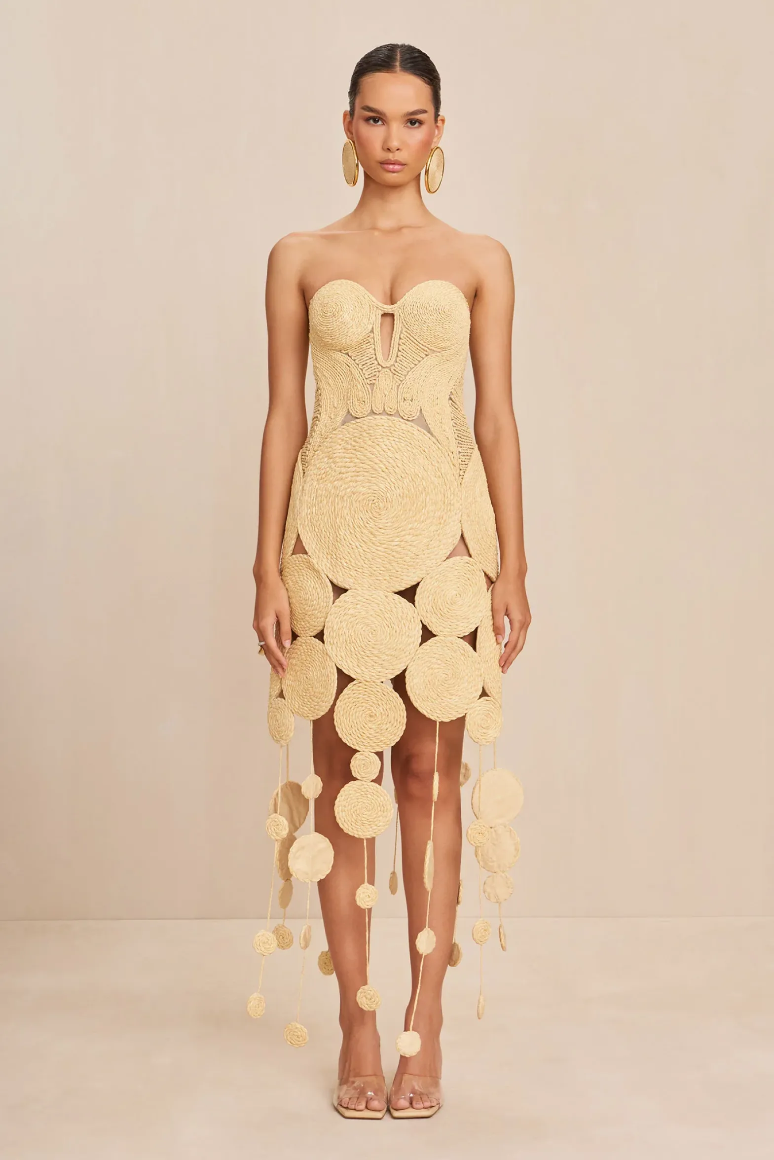 Introducing the Feliz Gown, a hand crochet art piece crafted from finely spun raffia. The strapless dress is designed with fitted inner corset and sculptural circular cutouts that waterfall from the hem for an opulent, eye-catching look.