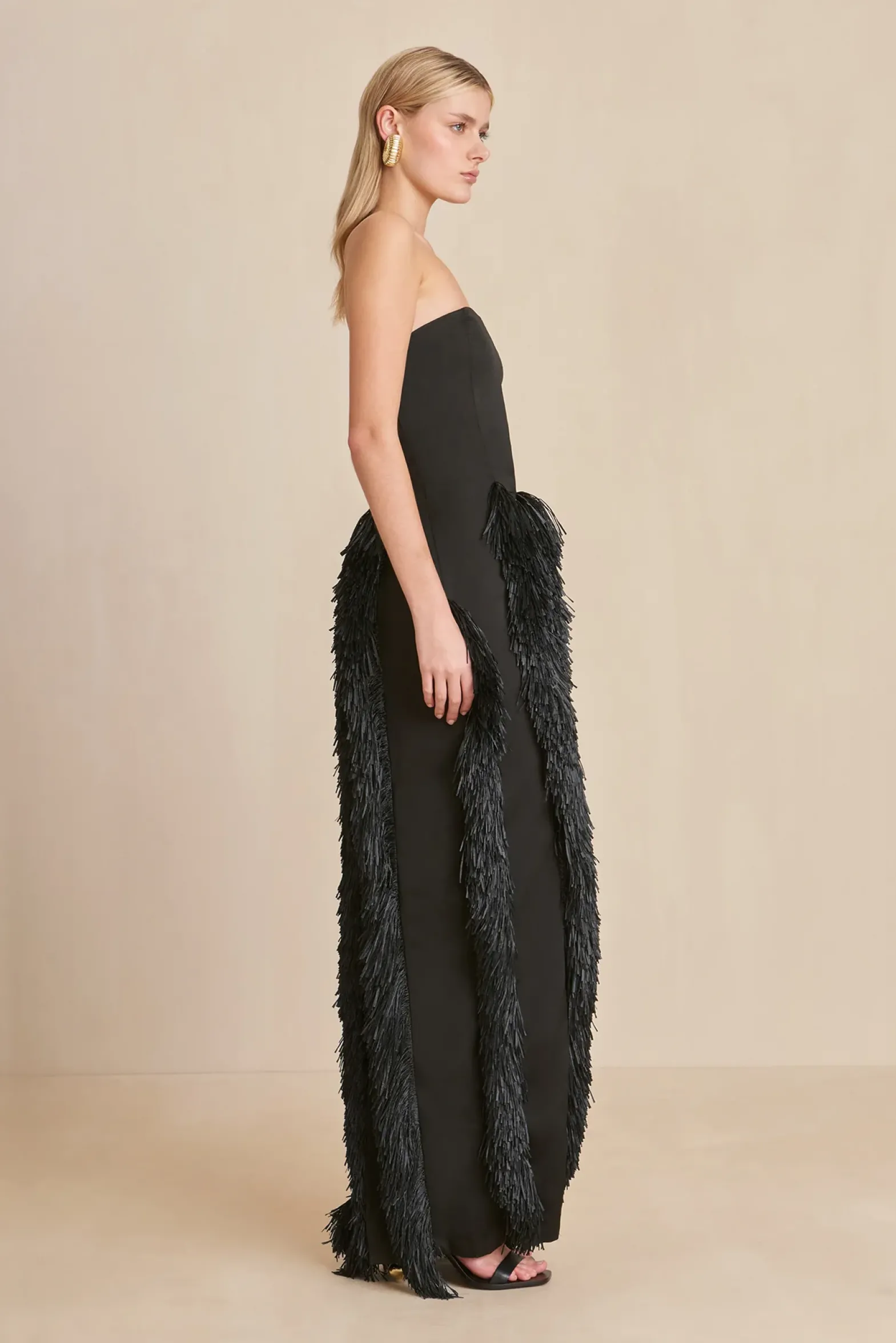 Featuring raffia detailing that begins at the waist and travels in a linear pattern down the classic, column silhouette of this gown, while the raffia fringe creates graceful movement and eye-catching extravagance on the strapless Freya Gown. The grosgrain fabric enhances the petal black hue. A side zip on the left allows for easy fit.