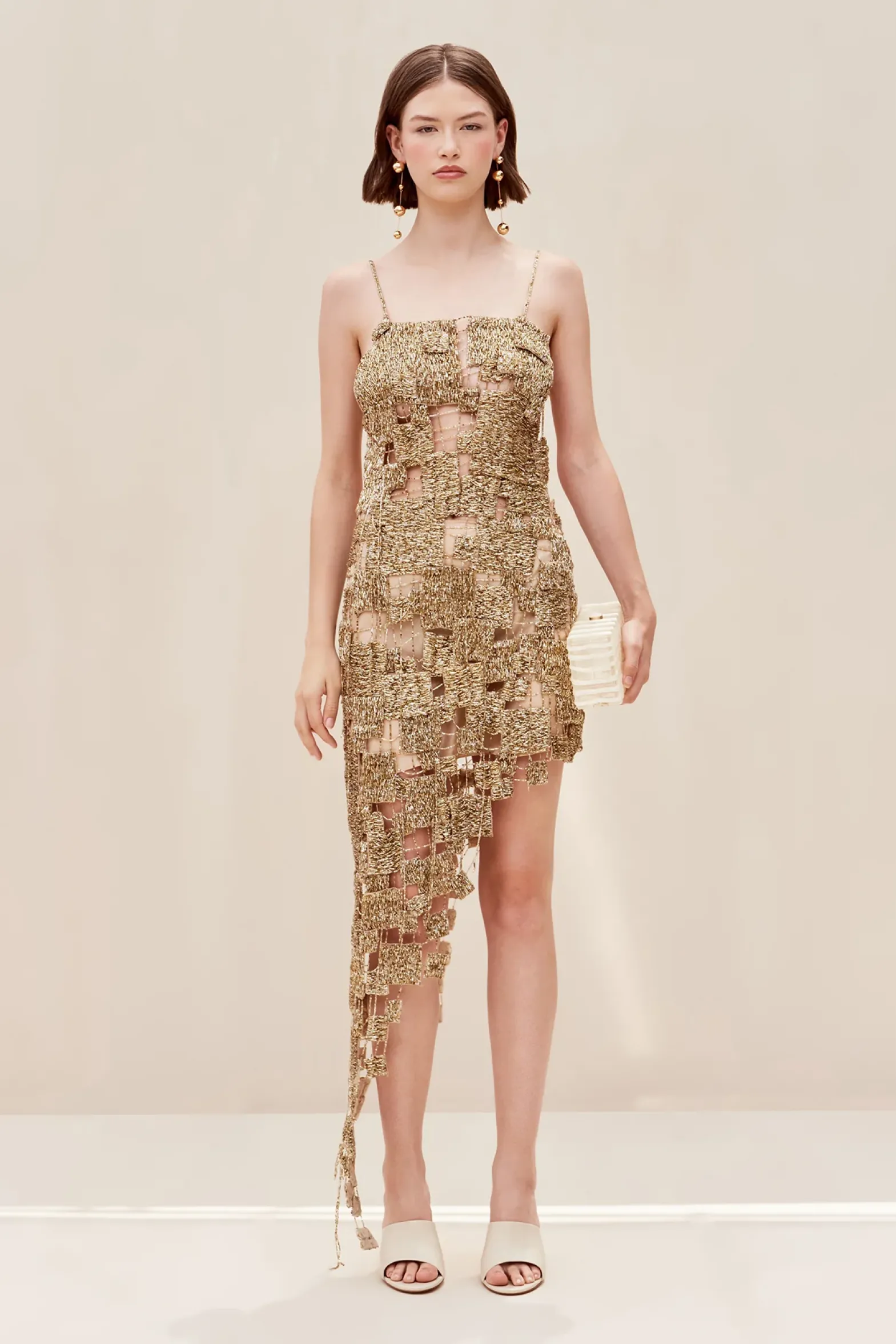 Lyana is a hand-beaded patchwork gown that shines through its artisanal craftsmanship. Hand-placed beaded panels are connected by beaded strings over a discrete lining. This dress provides elegant transparency and coverage. Her irregular hem compliments the organic patchwork.