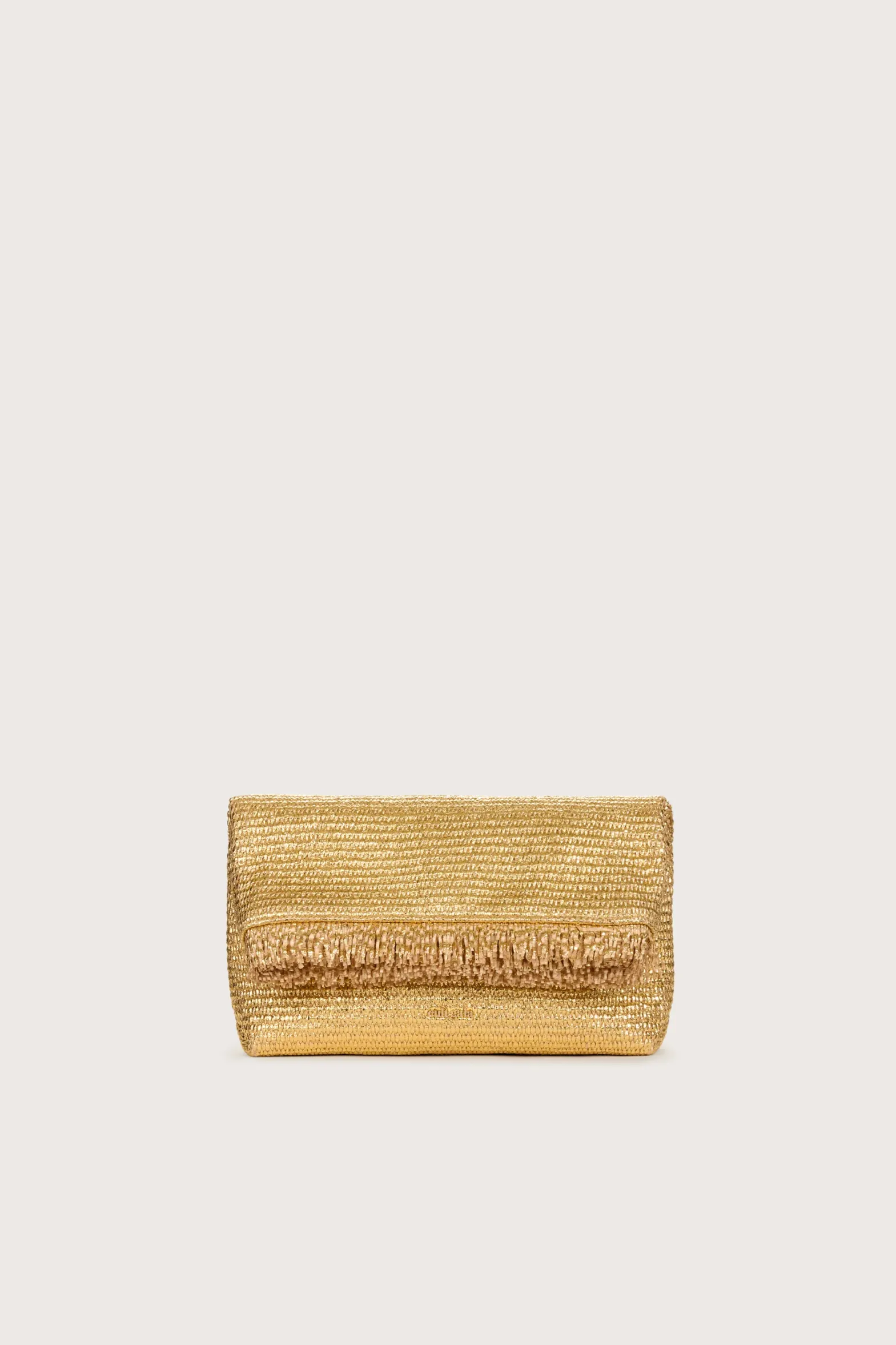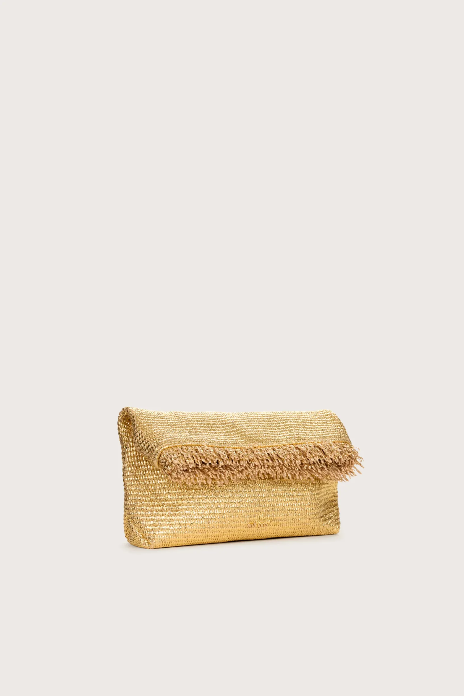 A mini gold painted raffia clutch with a natural raw edge fringe.