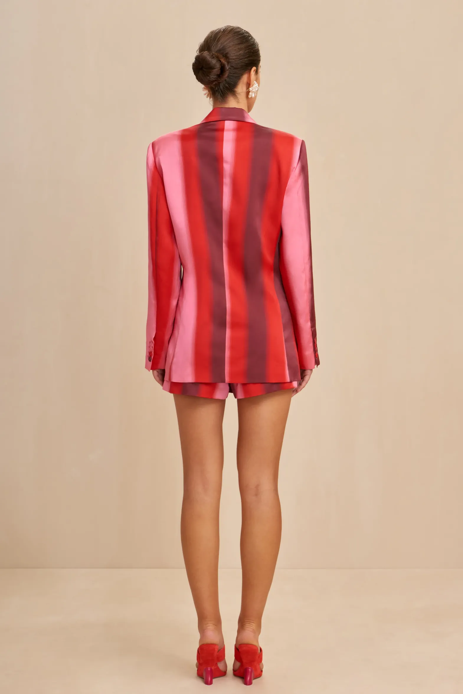 The Rene is a very Cult Gaia blazer. She is double breasted with fabric covered buttons. She has button details on her sleeves. She is structured and slim fit for a flattering profile. Designed to pair with the matching Leilani Skort in Lollipop.