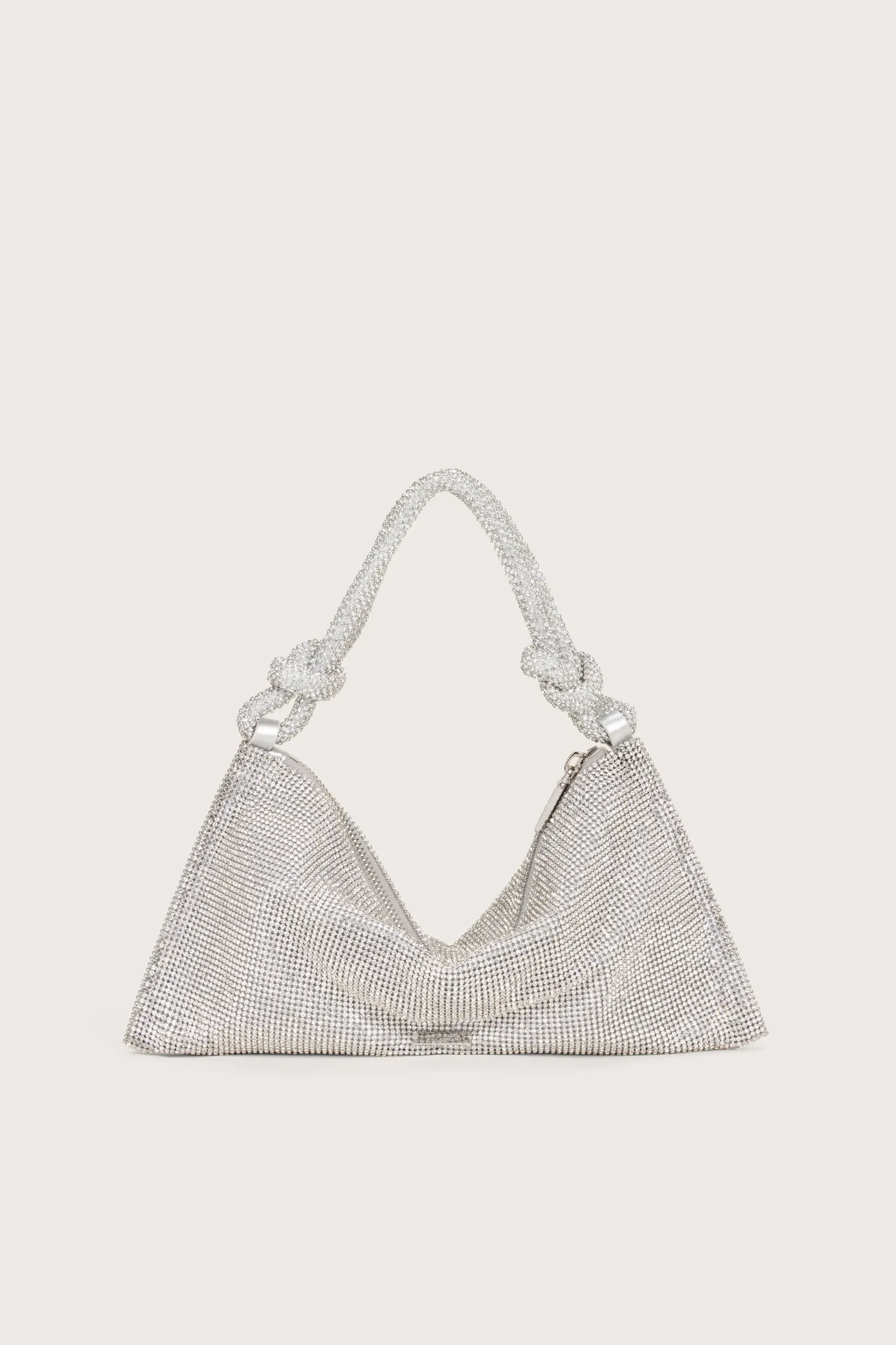 The Hera Shoulder, now available in an even smaller Nano. Crafted from eye-catching rhinestone that give a metallic silver shine, this classic design exudes femininity and grace with a knotted shoulder strap and a gorgeously slouchy silhouette. The frosted handheld bag is the perfect addition to add some Gaia sparkle to your life. Please note this size is much smaller than the Mini.