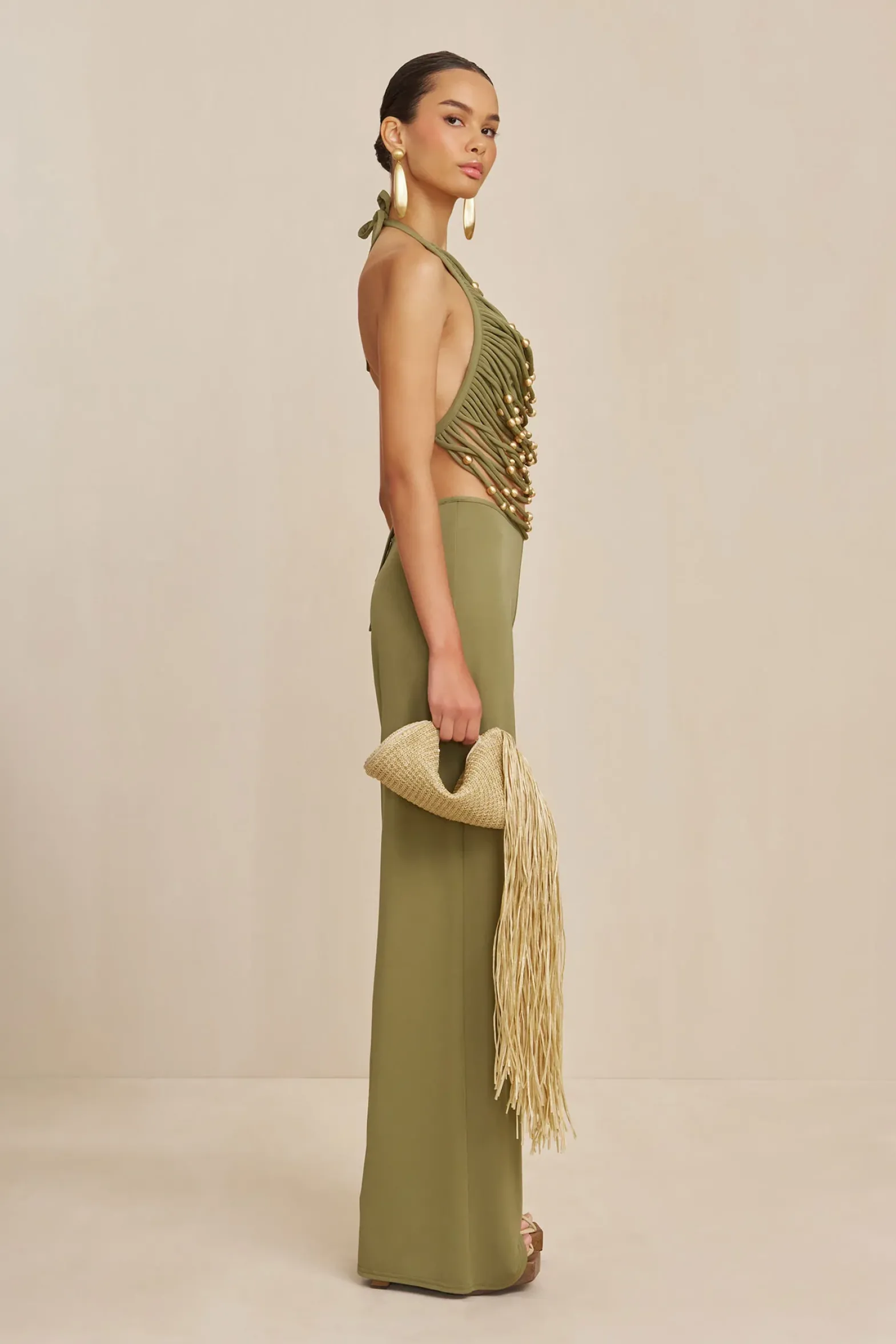 A halter top with tangled cording strung with various sized brass beads, attached bandeau and ties behind the neck.