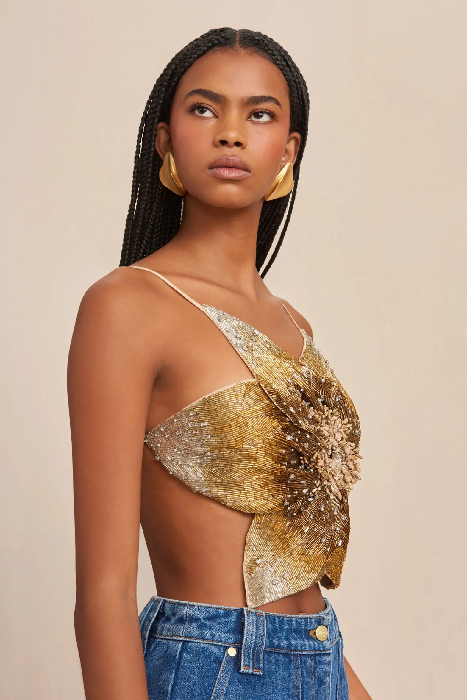 A hand-embroidered floral top with individually layered petals, central cutout and an open back.